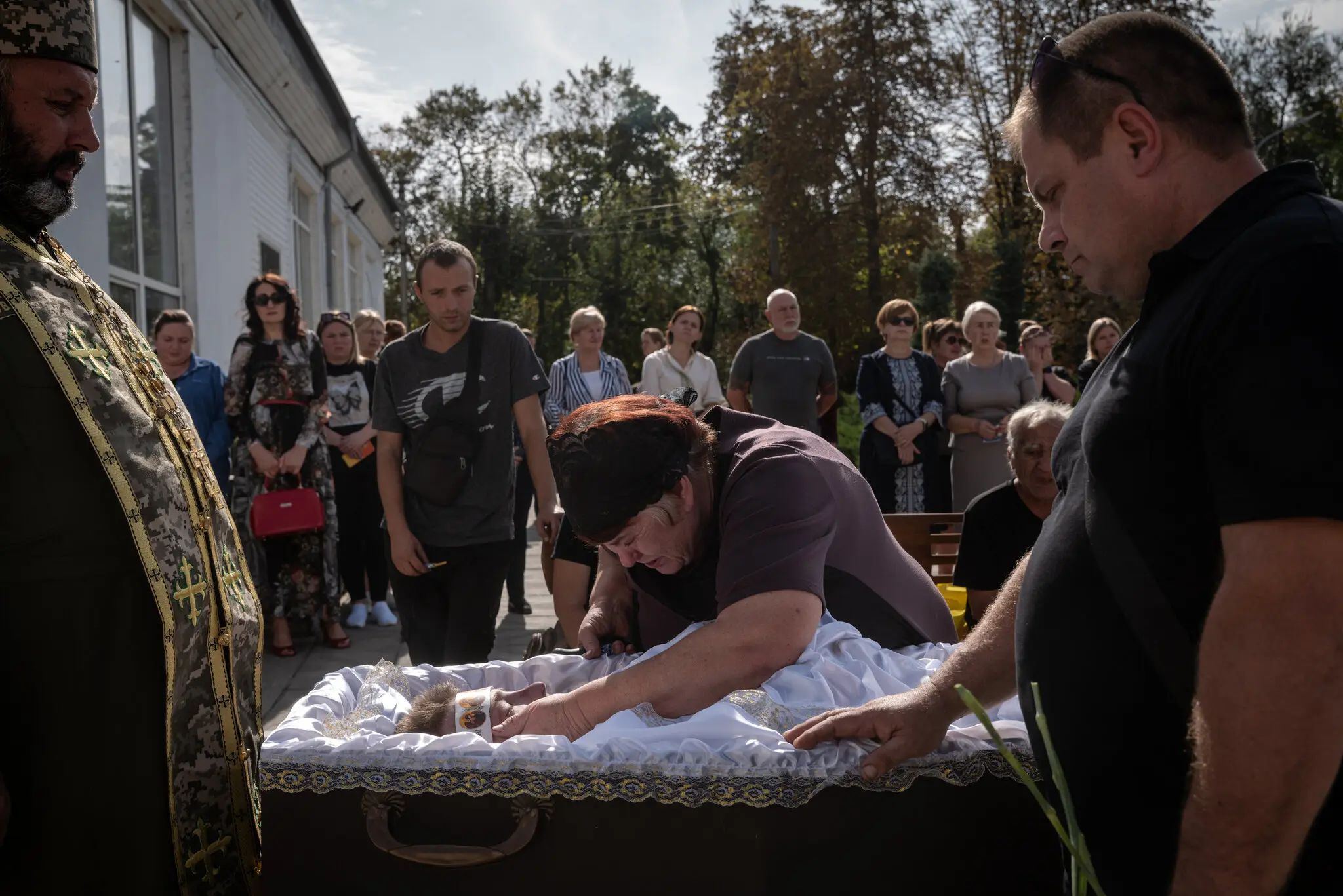 63-летняя Наталья Шрам оплакивает своего сына, 23-летнего украинского военнослужащего Богдана Шрама, в пятницу в Днепре. Он был убит в результате российского удара по городу Покровск неделей ранее. Фото…Николь Тунг для The New York Times