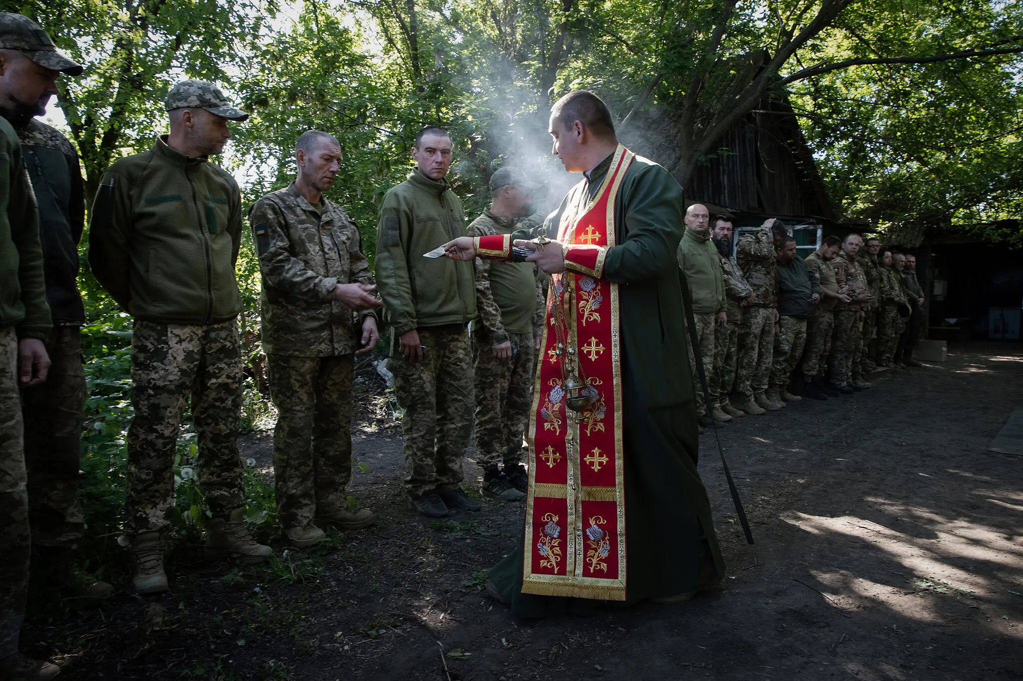 Капеллан Терещенко Иван Петрович, также известный как отец Иван, Православной Церкви Украины, благословляет солдат 72-й дивизии в Угледаре в мае. Фото…Тайлер Хикс/Нью-Йорк Таймс