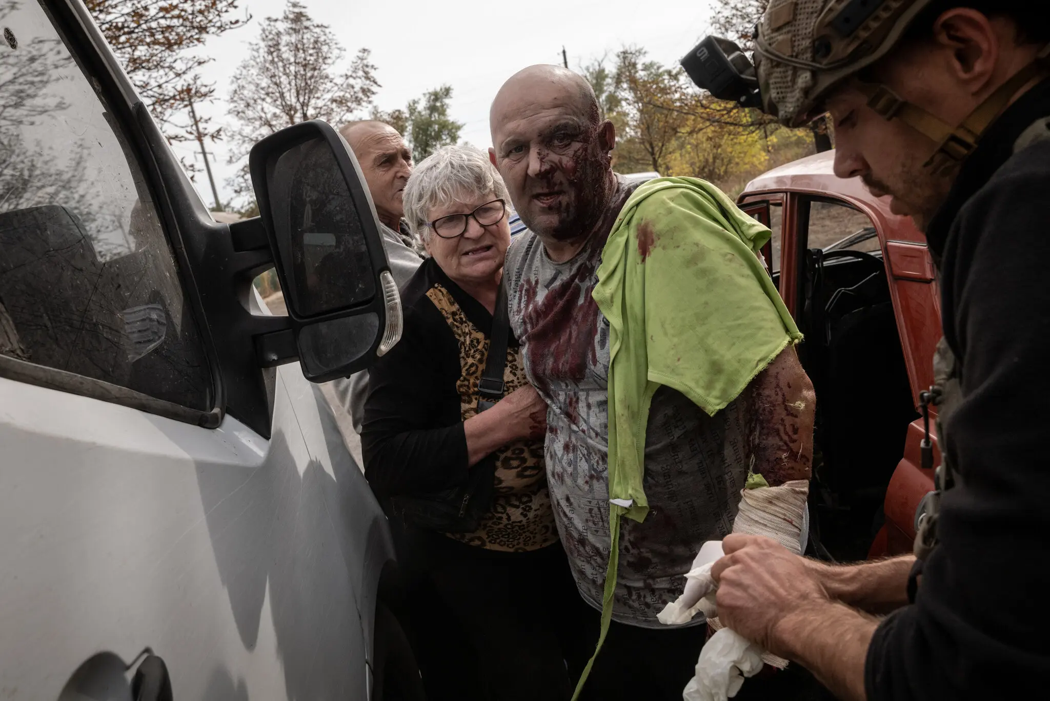 Андрію Хриштопе, пораненому мирному жителеві, допомагали інші жителі після того, як минулого місяця російський безпілотник врізався в його машину неподалік Вугледара, Україна. Фото…Ніколь Тунг для The New York Times