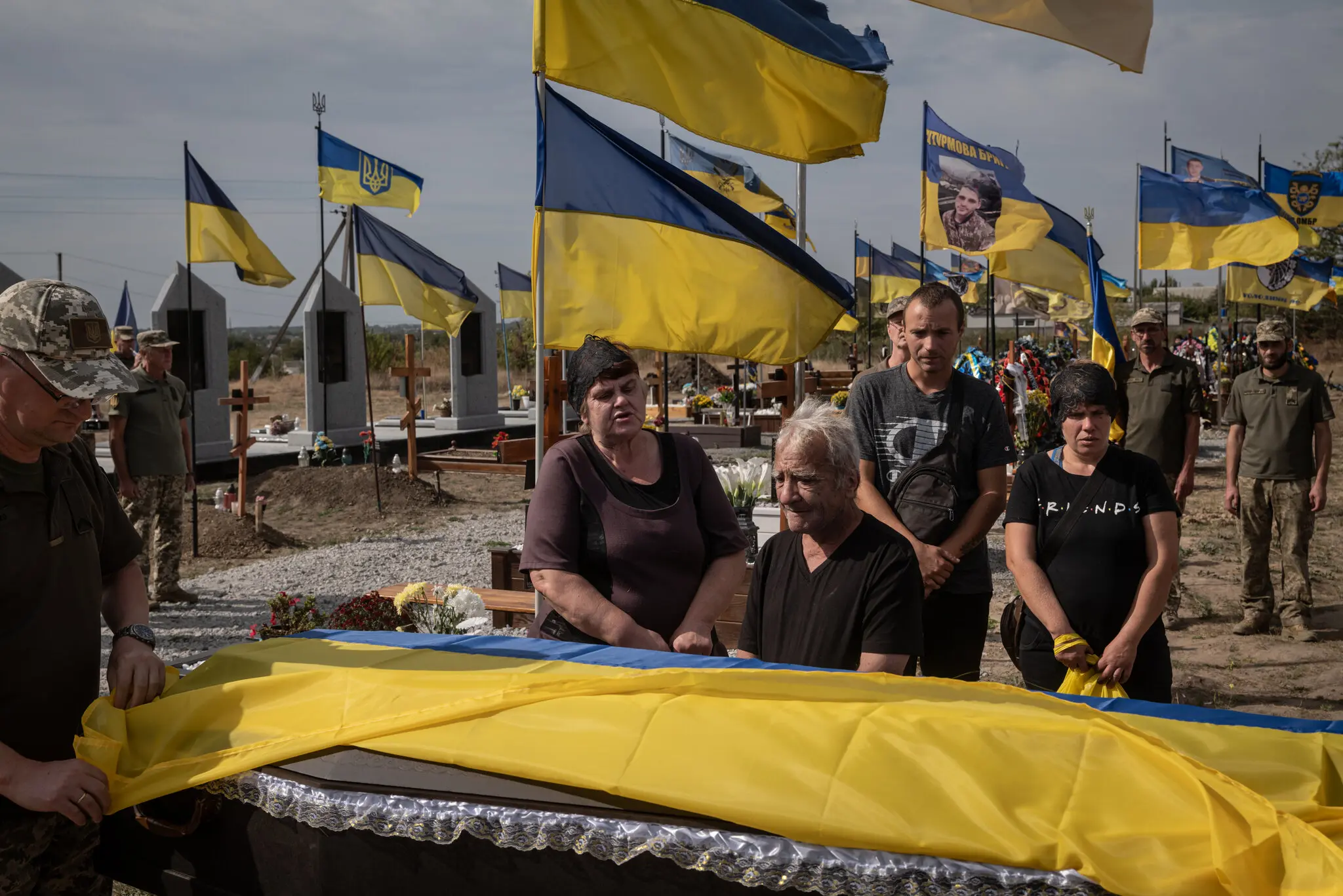 Сім’я 23-річного Богдана Шрама під час його похорону минулого місяця у Дніпрі, Україна. У той час як росіяни перевершують українські сили за чисельністю та озброєнням, вони сподіваються знекровити ворога до паралічу поля бою. Фото…Ніколь Тунг для The New York Times