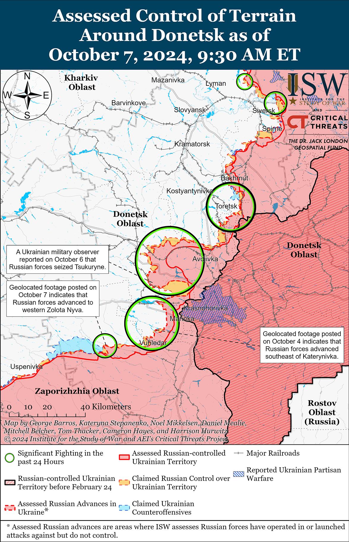 Сообщается, что 7 октября российские войска продвинулись к западу от Донецка на фоне продолжающихся наступательных действий в этом районе. Украинские и российские источники заявили, что российские войска захватили половину Максимильяновки, что указывает на то, что российские войска, вероятно, продвинулись в центральную часть населенного пункта. [41] Связанный с Кремлем российский военный блогер заявил, что российские войска захватили западную окраину Острое и продвигаются к Островскому железнодорожному пути и к северу от Максимильяновки, хотя в ISW не обнаружили визуального подтверждения этого заявления. [42] 6 и 7 октября враг продолжал наступательные действия к западу от Донецка в районе Острого, Островского и Георгиевки, а также со стороны Александровки. [43] Сообщается, что на Кураховском направлении действуют подразделения 33-го мотострелкового полка России (20-я мотострелковая дивизия, 8-я ОА, Южный военный округ). [44]