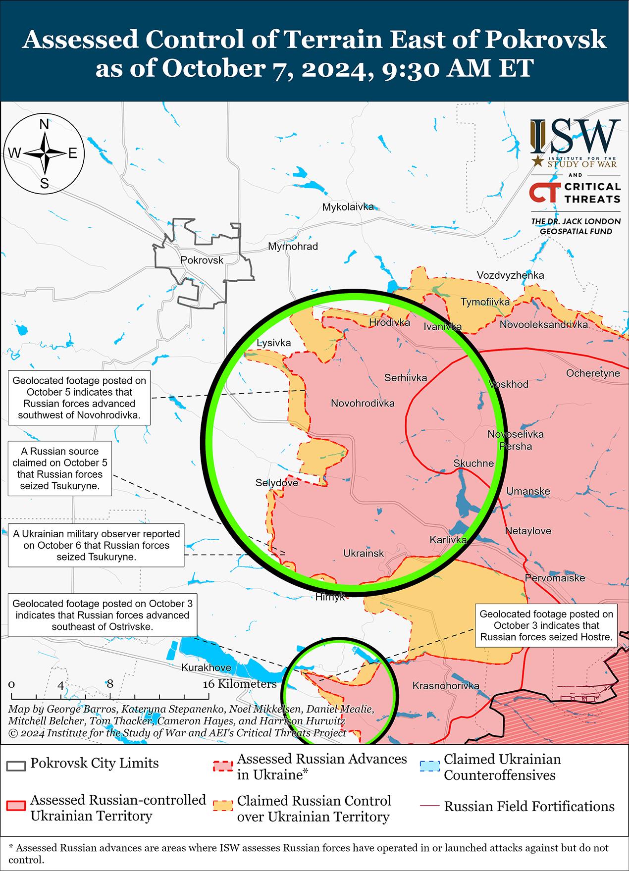 Сообщается, что 6 и 7 октября российские войска захватили Цукурино (к юго-востоку от Покровска) на фоне продолжающихся наступательных операций к востоку и юго-востоку от Покровска. Украинские военные наблюдатели заявили 6 октября, что российские войска вытеснили украинские войска с птицефабрики в восточном Цукурино и захватили оставшуюся часть населенного пункта. [37] Министерство обороны России заявило, что российские войска захватили Гродовку (к востоку от Покровска), а министр обороны России Андрей Белоусов отдал должное подразделениям 55-й мотострелковой бригады (41-я общевойсковая армия, Центральный военный округ), 74-й мотострелковой бригады (41-я ОА, ЦВО), 35-й мотострелковой бригады (41-я ОА) и 201-й военной базы (ЦВО). [38] Однако ISW не зафиксировал визуальных подтверждений действий российских войск в северных или восточных районах Гродовки. Российские военные блогеры утверждали, что российские войска захватили Желанное Второе (к юго-востоку от Покровска) и продвинулись к востоку от Покровска в районе Новогродовки и Лысовки и к юго-востоку от Покровска в районе Селидово, Новоселидовки, Измайловки, Горняка и Невского. [39] Однако ISW не обнаружил подтверждения этих заявлений. Также враг продолжил наступательные действия к востоку от Покровска в районах населенных пунктов Новотроицкое, Проминь, Новоторецкое, Мирноград, Лысовка и Крутой Яр; южнее Покровска в направлении Петровки; и юго-восточнее Покровска в районе Новогродовки, Николаевки, Селидово, Новоселидовки, Горняка, Цукурино и Желанного Второго 6 и 7 октября. [40]