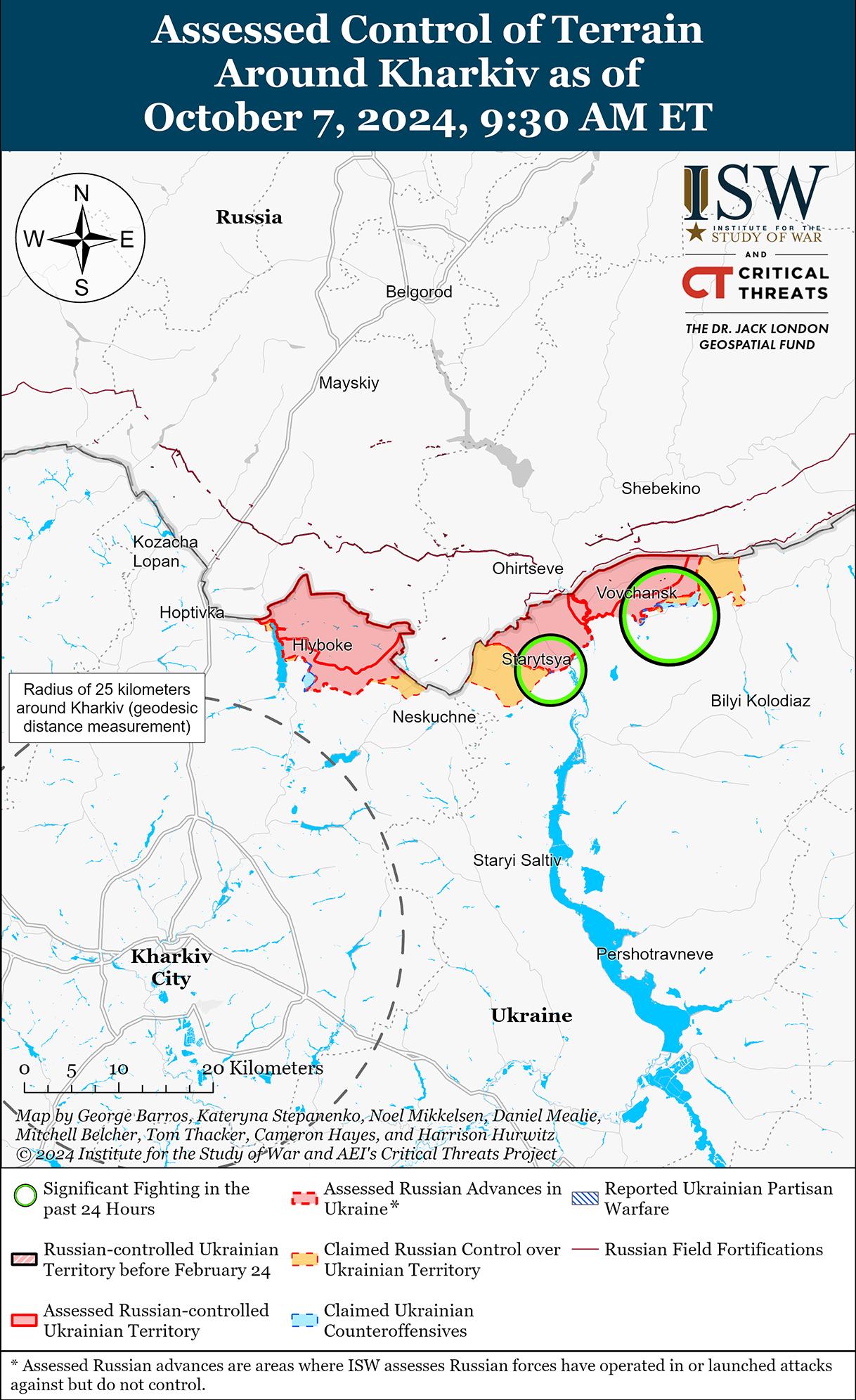 В последнее время российские войска продвинулись на севере Харьковской области на фоне продолжающихся наступательных действий в этом районе 7 октября. Геолоцированные кадры, опубликованные 27 сентября, указывают на то, что российские войска продвинулись в центре Волчанска, хотя и маловероятно за последнюю неделю. [21] Российские военные блогеры заявили 7 октября, что российские войска захватили Волчанский агрегатный завод, хотя в ISW не обнаружили визуального подтверждения этого заявления. [22] 6 и 7 октября российские войска продолжили атаки к северо-востоку от Харькова в районе Волчанска, Тихое и Старицы. [23] Пресс-секретарь Харьковской группировки войск полковник Виталий Саранцев заявил 7 октября, что за прошедшую неделю российские войска нанесли удары по Волчанску с использованием в общей сложности более 100 бронетранспортеров (БТР) и большого количества личного состава. [24] Саранцев также заявил, что за последнюю неделю российские войска усилили действия тактической авиации и беспилотников на Харьковском направлении. [25]