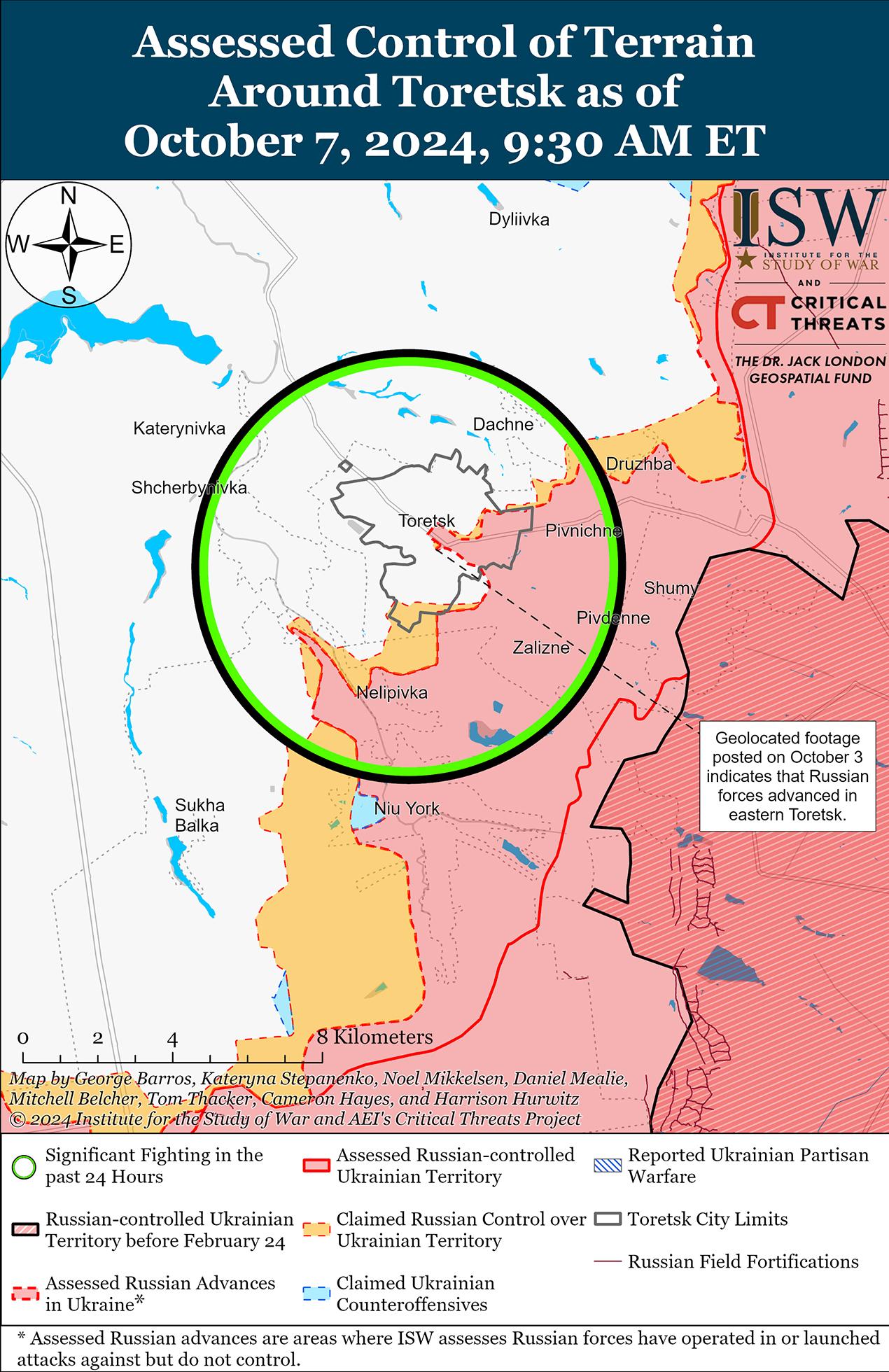 Враг продолжил наступательные действия к северу от Торецка в районе Дилиевки; под самим Торецком; и южнее Торецка в районе Нью-Йорка, Нелиповки, а также в направлении Щербиновки 6 и 7 октября, но подтвержденных изменений на линии фронта не было. [35] Российские военные блогеры утверждали, что российские войска продвинулись вдоль улиц Рудничной и Торговой в центре Торецка и приближаются к шахте «Центральная» в центре Торецка, однако в ISW не обнаружили визуального подтверждения этих заявлений. [36]