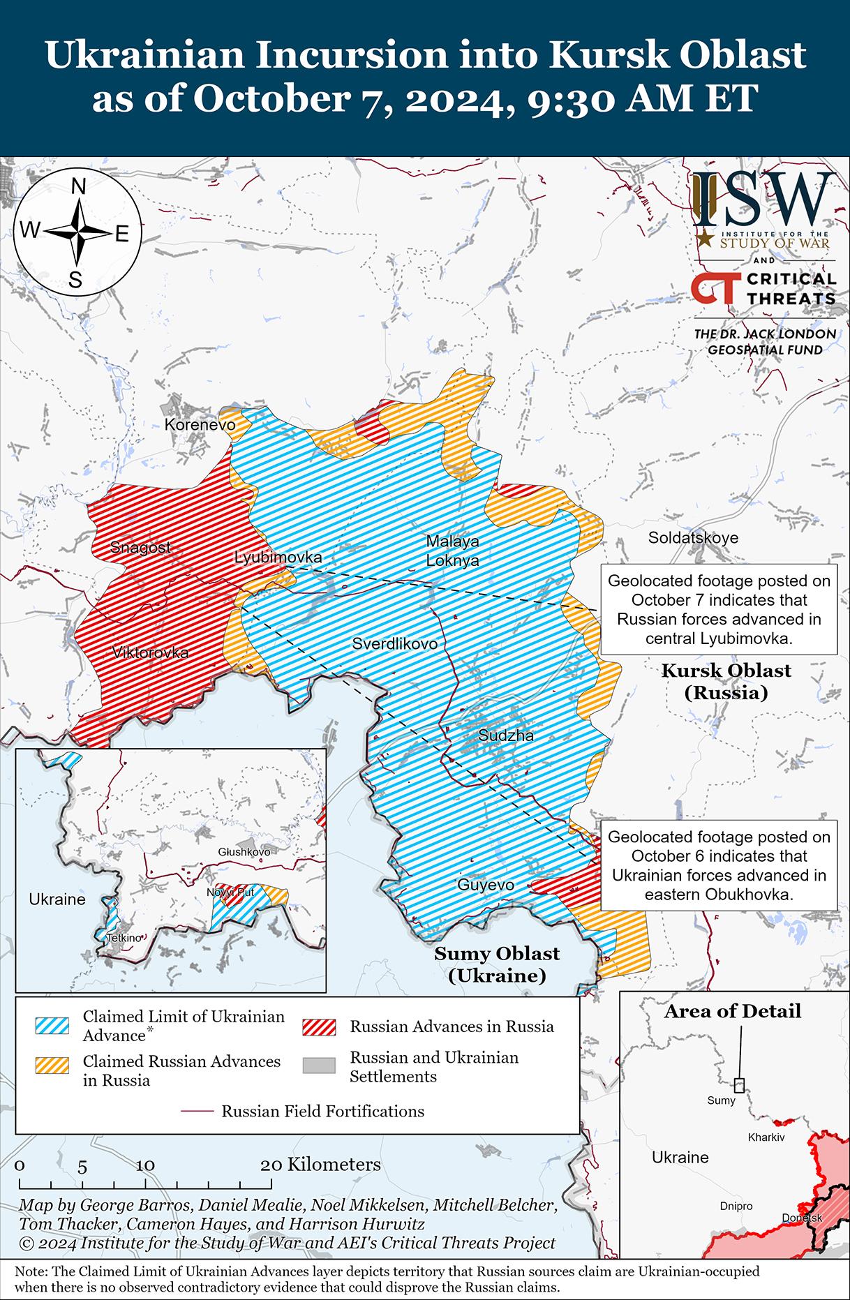 В последнее время украинские войска продвинулись в пределах основного украинского выступа в Курской области на фоне продолжающихся действий в этом районе 7 октября. Геолоцированные кадры, опубликованные 6 октября, свидетельствуют о том, что украинские войска продвинулись к югу от Обуховки (к югу от Коренево). [17] Сообщается, что украинские войска атаковали к югу от Коренево в районе Обуховки; к востоку от Коренево в районе Кремяного; юго-восточнее Коренево в районе Любимовки и Плехово; и севернее Суджи в районе Камышевки 6 и 7 октября. [18]