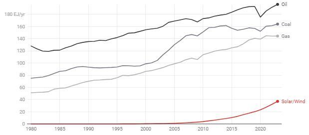 В нашем отчете говорится о продолжающемся росте выбросов ископаемого топлива, которые остаются на рекордно высоком уровне. Несмотря на многолетние предупреждения ученых, потребление ископаемого топлива растет, подталкивая планету к опасному уровню потепления. В то время как ветровая и солнечная энергетика стремительно растет, потребление ископаемого топлива в 14 раз больше.