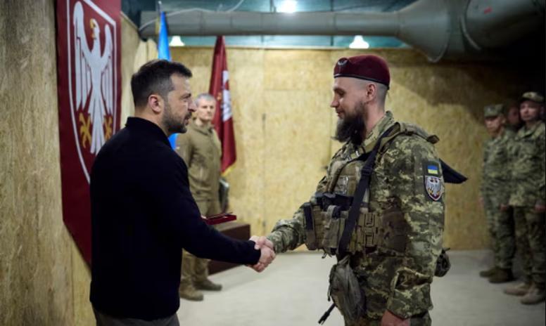 Володимир Зеленський з українським військовослужбовцем у Сумській області, Україна, 4 жовтня 2024 року. Фото: Прес-служба Президента України/AFP