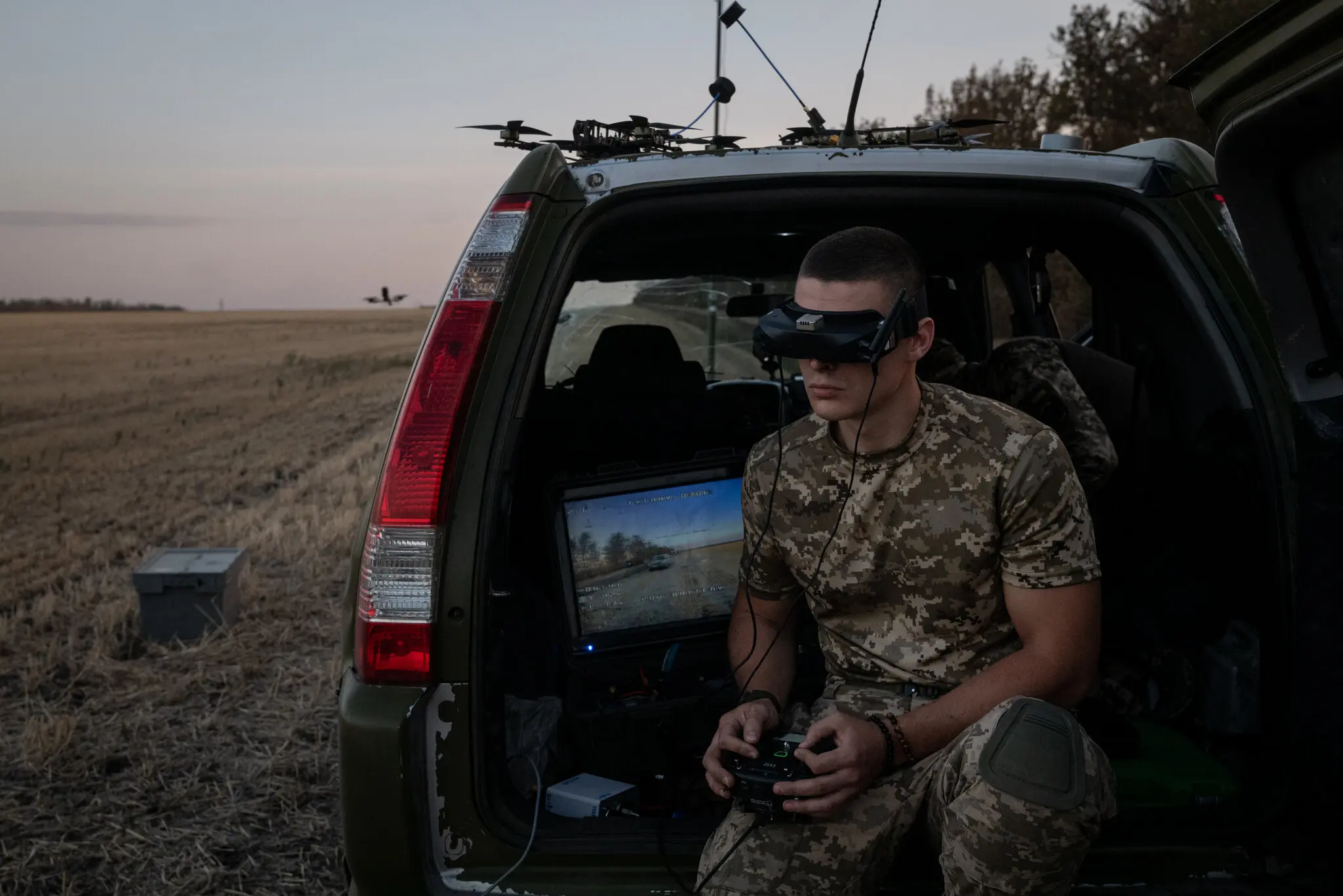 Ближе к земле небо заполнено относительно дешевыми расходуемыми ударными дронами, известными как F.P.V., для вида от первого лица. Они управляются оператором (пилотом) в гарнитуре, которая показывает потоковое видео с дрона, и теперь могут поражать цели на расстоянии более 10 миль (16 км) от оператора.