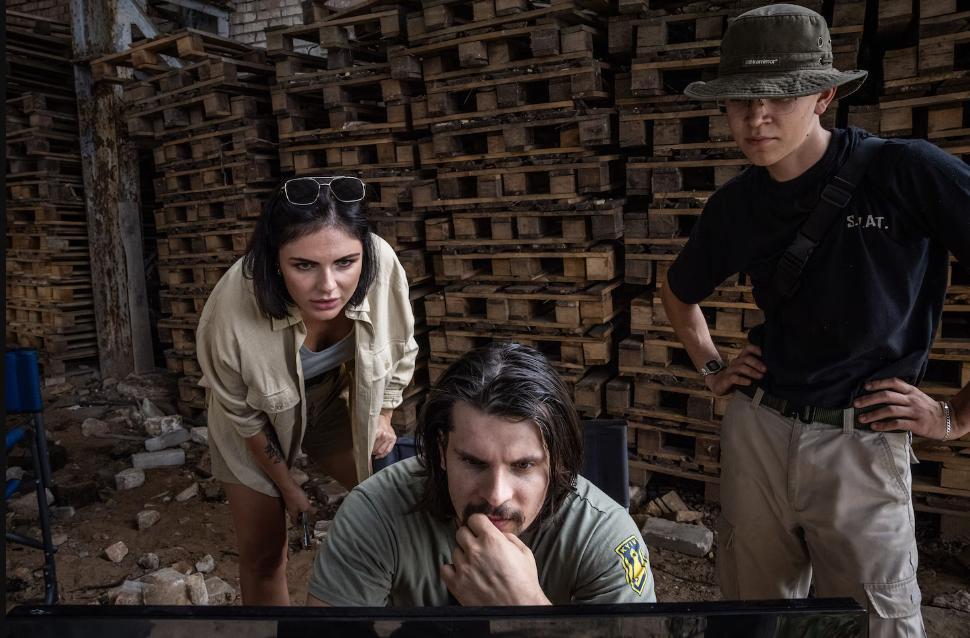 Кристина Бондаренко, руководитель маркетинговой команды 3-й штурмовой бригады, арт-директор Влад Кулик и фотограф рассматривают снимки, сделанные для очередного военного набора бригады в Киеве. (Эд Рам для The Washington Post)