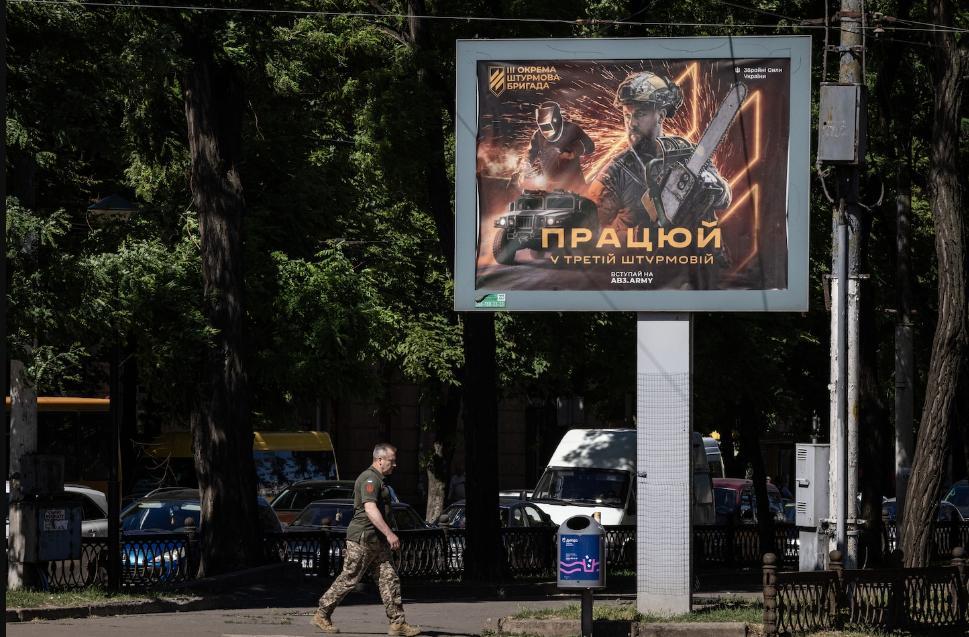 Мужчина в военной форме проходит под плакатом о призыве в 3-ю штурмовую бригаду с надписью «Служи в третьей» в центре Днепра, Украина, 24 мая. (Эд Рам для The Washington Post)