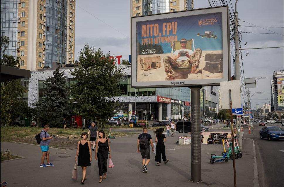 Люди проходят мимо таблички набора в 3-ю штурмовую бригаду с надписью «Лето, FPV, третья штурмовая» на улицах Киева 31 августа. (Эд Рам для The Washington Post)