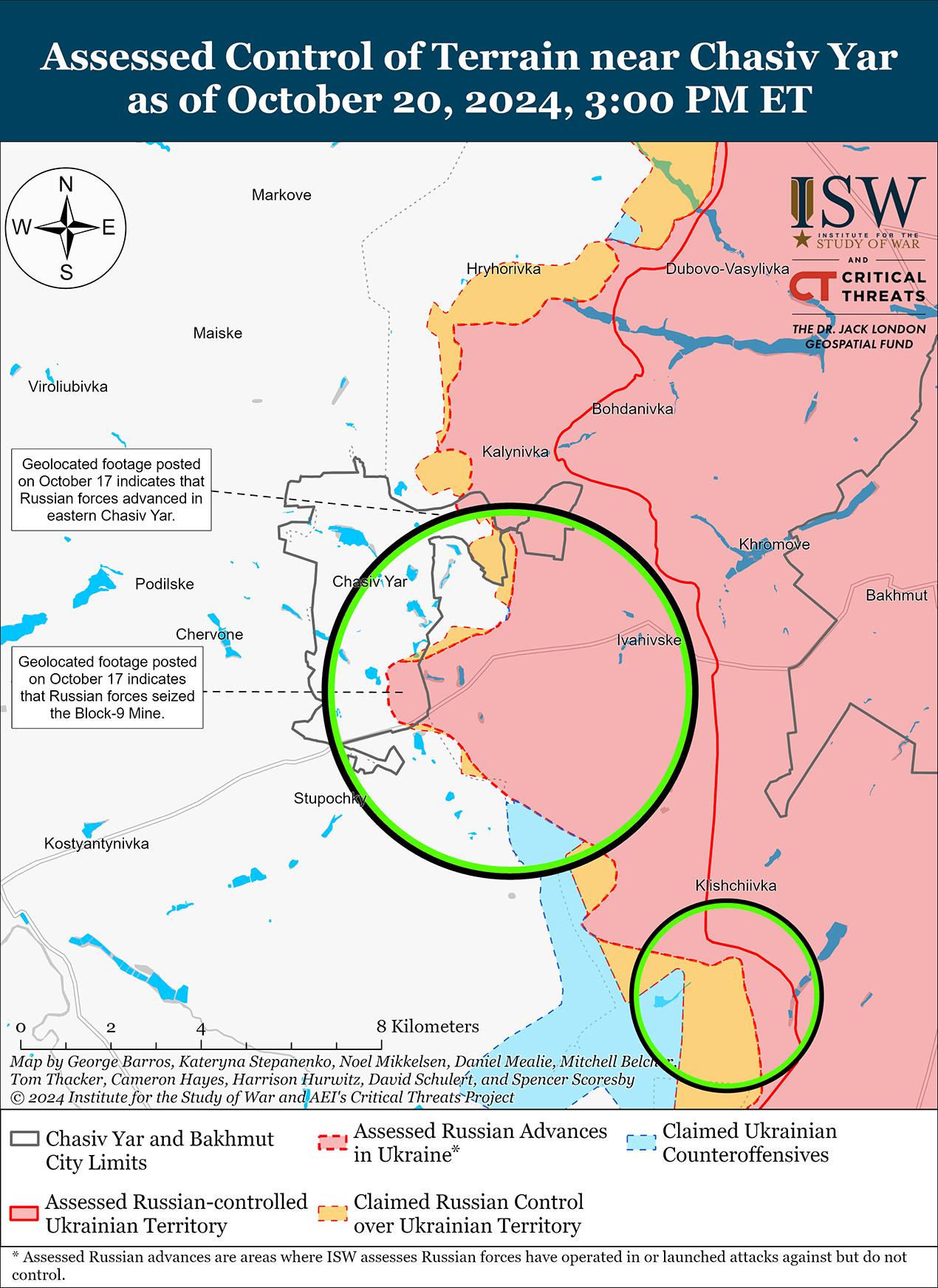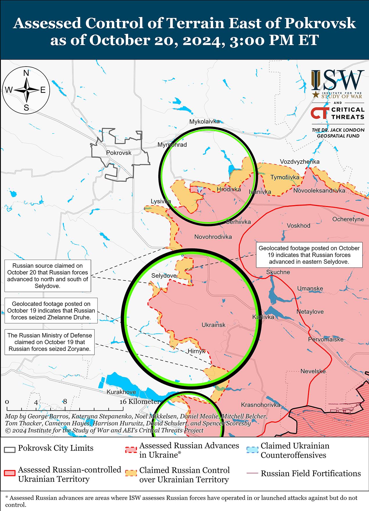 Российские войска недавно незначительно продвинулись к юго-востоку от Покровска на фоне продолжающихся наступательных действий к востоку и юго-востоку от населенного пункта 20 октября. Геолоцированные кадры, опубликованные 20 октября, указывают на то, что российские войска в последнее время незначительно продвинулись на северо-восточных окраинах Селидово (к юго-востоку от Покровска). [42] Российские военные блогеры утверждали, что российские войска продвинулись по неуказанным улицам в восточной части Селидово и атакуют населенный пункт с севера и юга. [43] Некоторые российские военные блогеры утверждали, что российские войска продвинулись к окраинам Вишневого (к югу от Покровска и непосредственно к западу от Селидово) с юга вдоль железнодорожной линии. [44] Российские военные блогеры также утверждали, что российские войска продвинулись в Воздвиженку (к востоку от Покровска) и в районе Горняка (к юго-востоку от Покровска). [45] Однако ISW не обнаружил подтверждения этих заявлений. 19 и 20 октября враг продолжил штурмовые действия к востоку от Покровска в районах населенных пунктов Воздвиженка, Проминь, Миролюбовка и Новоторецкое, а также к юго-востоку от Покровска в районах населенных пунктов Сухой Яр, Михайловка, Селидово, Новодмитровка, Горняк, Желанное Второе и Зоряное. [46] Российский военный блогер утверждал, что российские войска отразили украинскую механизированную контратаку численностью до взвода в районе Цукурино (к юго-востоку от Покровска и Селидово). [47] Сообщается, что подразделения российской 15-й мотострелковой бригады (2-я общевойсковая армия, Центральный военный округ) продолжают действовать на Покровском направлении. [48]