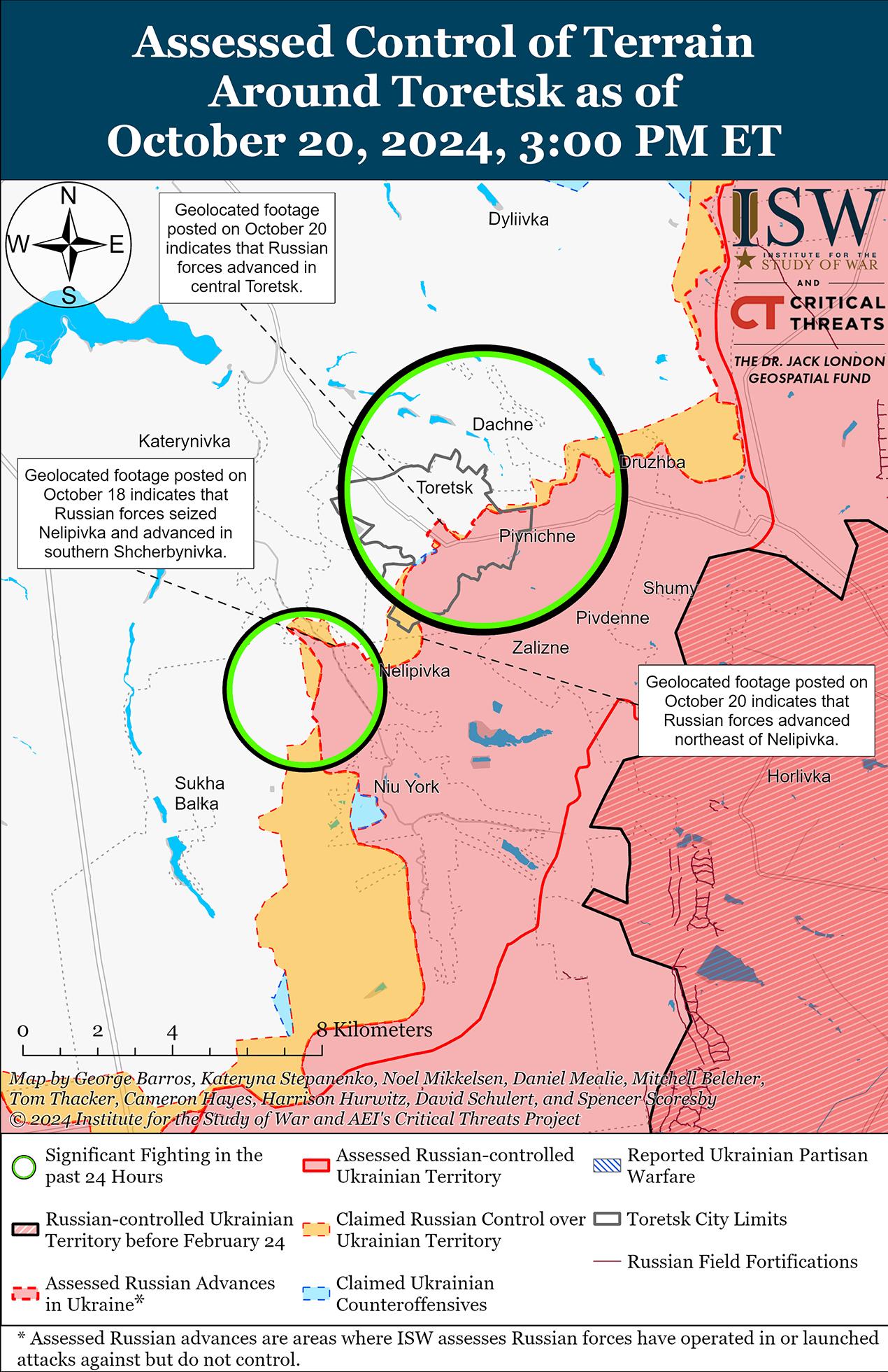 В последнее время российские войска продвинулись под Торецком на фоне продолжающихся наступательных действий в этом районе 20 октября. Геолоцированные кадры, опубликованные 20 октября, указывают на то, что российские войска недавно продвинулись к северо-востоку от Нелиповки (к югу от Торецка) и вдоль улицы Дружбы в центре Торецка. [39] Российские военные блогеры утверждали, что российские войска также продвинулись к югу от Торецка, в том числе в районе Нью-Йорка, однако в ISW не обнаружили визуальных подтверждений дальнейшего продвижения российских войск в этом районе. [40] 19 и 20 октября российские войска продолжили наступательные действия к северу от Торецка в районе Александро-Шультино, в районе самого Торецка и к юго-западу от Торецка в районе Щербиновки. [41]