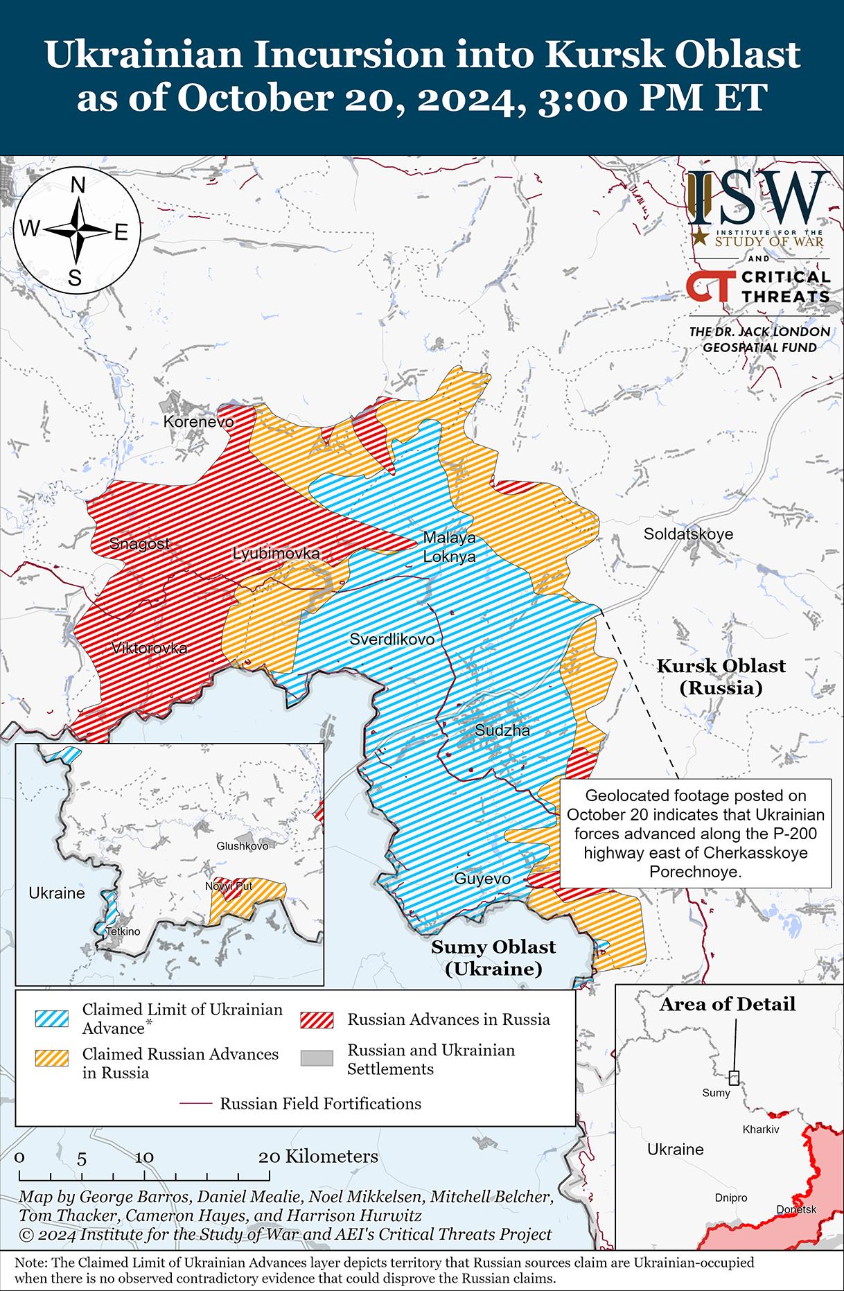 20 октября украинские войска продвинулись к северу от Суджи на фоне продолжающихся боев на главном выступе Украины в Курской области. Геолоцированные кадры, опубликованные 20 октября, указывают на то, что украинские войска недавно продвинулись к востоку от Черкасского Поречного (к северу от Суджи). [25] Российские источники утверждали, что российские войска атаковали к северу от Суджи в районе Малой Локни и к юго-востоку от Суджи в районе Плехово, а украинские войска атаковали к юго-востоку от Коренево в районе Кругленькое и Леонидово. [26] Связанный с Кремлем российский военный блогер заявил, что информация о захвате российскими войсками Плехово не подтверждена. [27] Сообщается, что подразделения российской 155-й бригады морской пехоты (Тихоокеанский флот, Восточный военный округ [ВВО]) действуют в районе Зеленого Шляха (к юго-востоку от Коренево), а в Курской области – подразделения разведывательной группы «Алабай». [28]