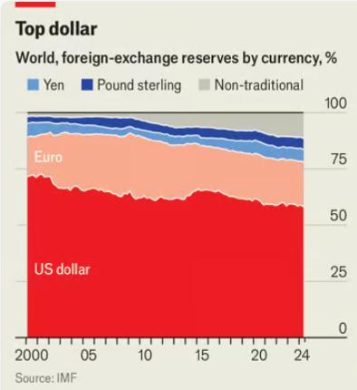 Доминирование Америки в мировой финансовой системе было опорой послевоенного порядка. Это отражает ее экономический и военный вес, а также тот факт, что долларовые активы, такие как казначейские облигации, считаются защищенными от государственной конфискации и инфляции, и их легко купить и продать. Несмотря на то, что центральные банки диверсифицировали свои активы, в том числе в золото, около 58% валютных резервов находятся в долларах (см. график), а сетевые эффекты доллара ставят американские банки в центр мировых платежных систем. Отправка денег по всему миру немного похожа на дальнемагистральный перелет; если два аэропорта не связаны между собой напрямую, пассажирам придется пересесть на другой рейс, в идеале в оживленном хабе, где стыкуется множество других самолетов. В мире международных платежей крупнейшим узлом является Америка, где многие банки мира обменивают иностранные валюты с тех, кто осуществляет платежи, на доллары, а затем на валюты, в которых поступают платежи.
