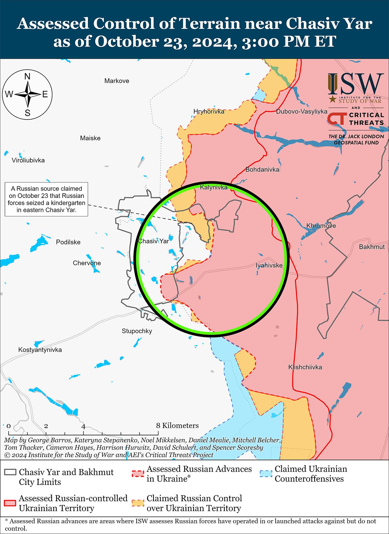 Российские источники утверждают, что российские войска в последнее время продвинулись в направлении Часова Яра, но ISW пока не наблюдал визуального подтверждения этих заявлений. Российские источники сделали неподтвержденные заявления о том, что российские войска продвинулись в северо-восточном и восточном Часовом Яру. [59] Пресс-секретарь Луганской группировки войск майор Анастасия Бобовникова сообщила, что некоторые российские штурмовые группы время от времени пересекают канал Северский-Донец Донбасс, но не прорывают украинскую оборону к западу от канала. [60] Бобовникова добавила, что российские войска не могут перебросить технику через канал, потому что удары украинской артиллерии и беспилотников мешают строительству понтонных переправ. Враг продолжил наступление к северо-востоку от Часова Яра в районе Григорьевки. [61] Российский военный блогер, связанный с российскими воздушно-десантными войсками (ВДВ), заявил, что украинские войска используют беспилотники с видом от первого лица (FPV) для нанесения ударов по российской военной технике в районе Покровского (примерно в 27 км к востоку от Часова Яра) с целью перекрытия российских наземных коммуникаций в Бахмут. [62] Военный блогер добавил, что говорить о прорыве России в Часов Яр преждевременно. Сообщается, что подразделения 217-го и 331-го полков ВДВ 98-й дивизии ВДВ действуют на северо-востоке Часова Яра и в районе Ступки Голубовские-2 (лесной массив к юго-востоку от Часова Яра) соответственно. [63] Сообщается, что на направлении Часов Яр действуют подразделения 5-го зенитно-ракетного полка (98-я дивизия ВДВ) и 88-й добровольческой бригады «Эспаньола» и бригады «Север-В» (обе входят в состав Российского добровольческого корпуса). [64] Сообщается, что к северу от Часова Яра действуют подразделения российской 200-й мотострелковой бригады (14-й АК Ленинградского военного округа) и другие неустановленные подразделения Российского добровольческого корпуса; и части 4-й отдельной мотострелковой бригады (3-й ОА) действуют к югу от Часова Яра. [65]