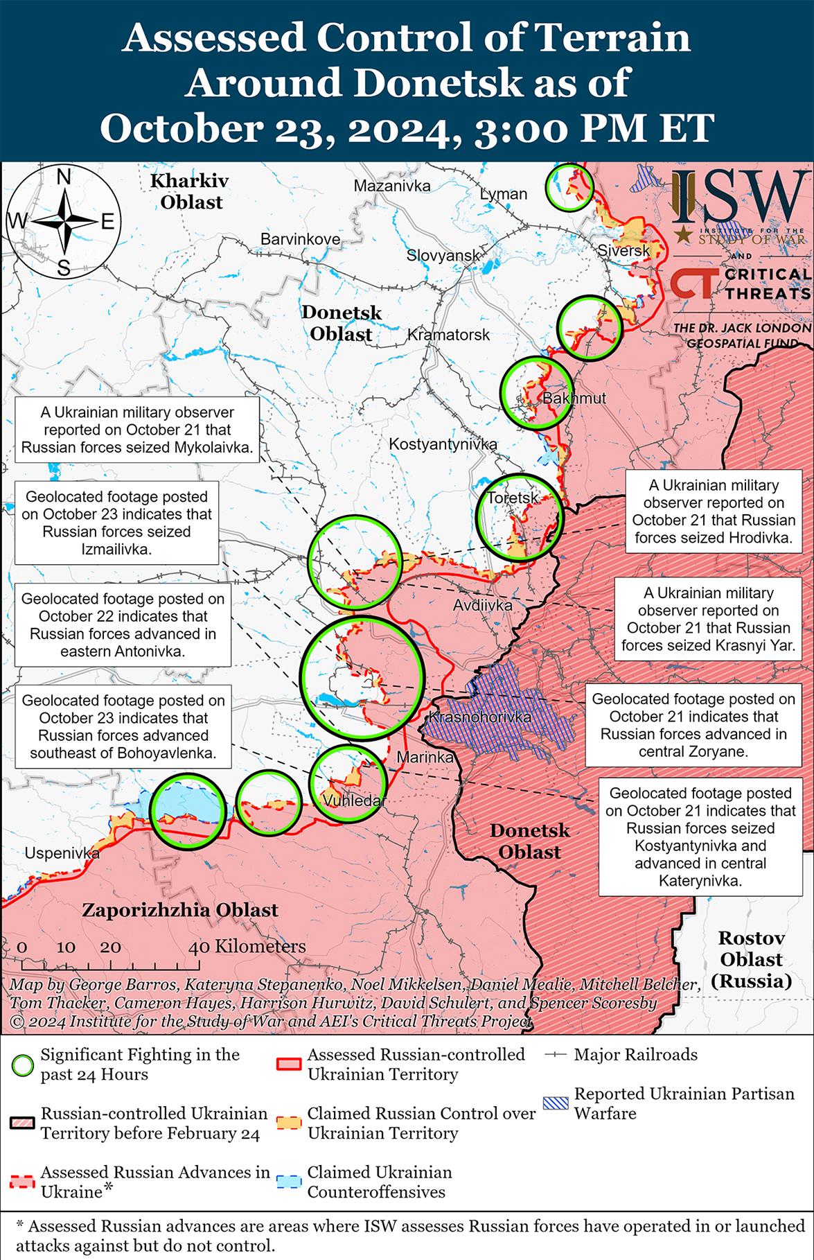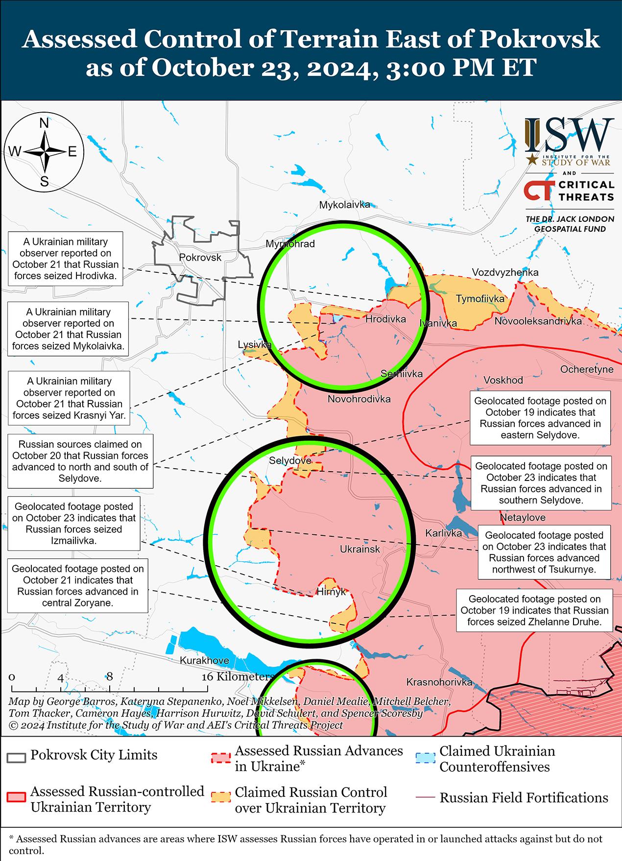 Россия вполне может взять Селидово в ближайшие дни, но взятие Селидово по своей сути не предвещает захвата Покровска, и, на самом деле, захват Селидово, вероятно, истощил и истощал российские войска таким образом, что, вероятно, снизит их боеспособность, если им будет приказано развернуться в сторону Покровска. Украинская оборона Покровска и подступов к нему (а именно железнодорожной линии и трассы М-30) уже заблокировала российское продвижение к городу, и истощение российских сил в этом районе, вероятно, еще больше замедлит это продвижение, нанеся ущерб российским наступательным перспективам в этом районе в ближайшие недели. [25]