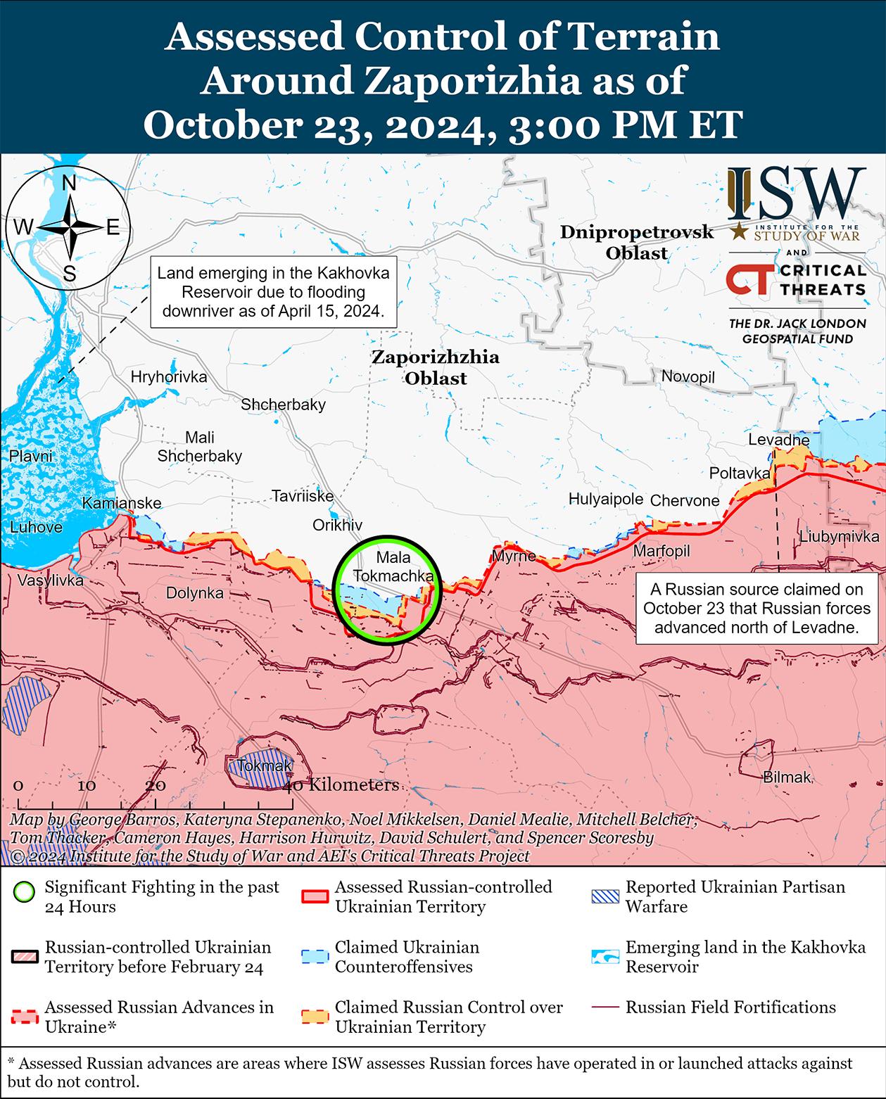 Глава оккупационной администрации Запорожской области Евгений Балицкий заявил 23 октября, что более 20 украинских беспилотников нанесли удары по гражданской инфраструктуре в районе Энергодара и административному зданию в Васильевке (к востоку от Энергодара) и отключили электричество в 13 близлежащих населенных пунктах. Однако ISW не может независимо подтвердить это заявление. [80]
