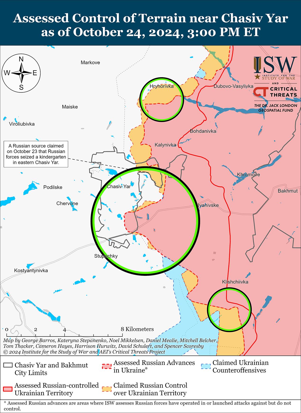 24 октября враг продолжил наступательные действия на направлении Часова Яра, но не продвинулся вперед. По сообщениям, российские войска продолжали наносить удары в восточной части Часова Яра; к северо-востоку от Часова Яра в районе Григорьевки; и к югу от Часова Яра в районе Предтечино, Белой Горы и Ступочков 23 и 24 октября. [40] Сообщается, что подразделения 98-й воздушно-десантной дивизии (ВДВ) продолжали действовать в районе Часова Яра. [41]