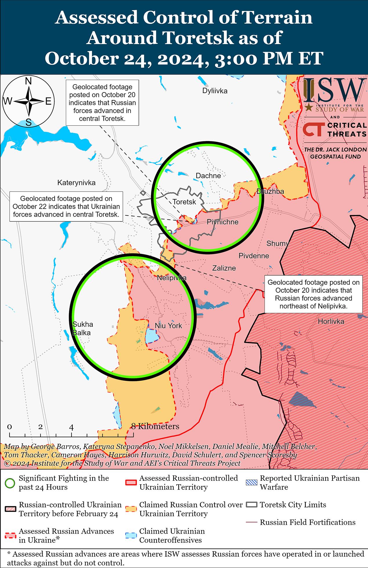 Украинские войска недавно восстановили тактические позиции в центре Торецка на фоне продолжающихся российских наступлений в населенном пункте и вокруг него 24 октября. На геолоцированных кадрах, опубликованных 22 и 23 октября, видно, как украинские войска действуют вдоль улицы Дзержинского в центре Торецка, где ISW ранее наблюдал продвижение российских войск, что указывает на то, что украинские войска недавно вернули утраченные позиции в этом районе. [42] Российский источник утверждал, что российские войска продвинулись в южной части Щербиновки (к западу от Торецка), но ISW не обнаружил визуальных доказательств, подтверждающих это заявление. [43] 23 и 24 октября враг продолжал наступление в Торецке и к юго-западу от Торецка в районе Нелиповки. [44] Сообщается, что на Торецком направлении действуют подразделения 132-й мотострелковой бригады (51-я ОА, бывший 1-й АК Донецкой Народной Республики [ДНР]) и операторы беспилотников «Русские ястребы» неустановленного родительского формирования. [45]