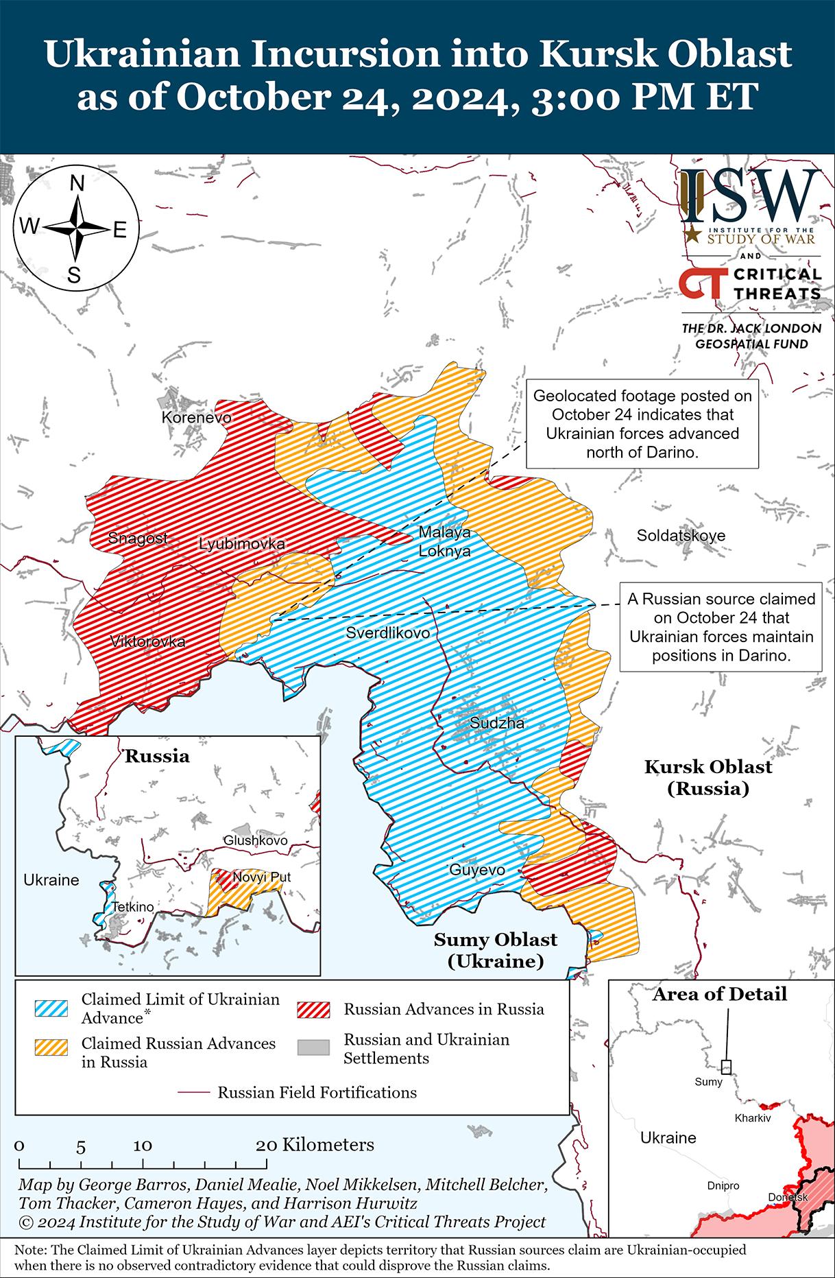 Президент России Владимир Путин попытался выразить уверенность России в способности российских военных отразить вторжение Украины в Курскую область на пресс-конференции после саммита БРИКС 24 октября. Путин заявил, что российские войска окружили около 2000 украинских солдат, которые сейчас «заблокированы» в Курской области. [13] Путин, в частности, не признал, что украинский выступ в Курской области простирается от украинско-российской международной границы и что украинские войска могут свободно пересекать участки границы, находящиеся под контролем Украины. Путин также заявил, что украинские войска потеряли около 26 000 человек личного состава во время операции в Курской области за последний «месяц с небольшим», что, вероятно, является большим преувеличением.