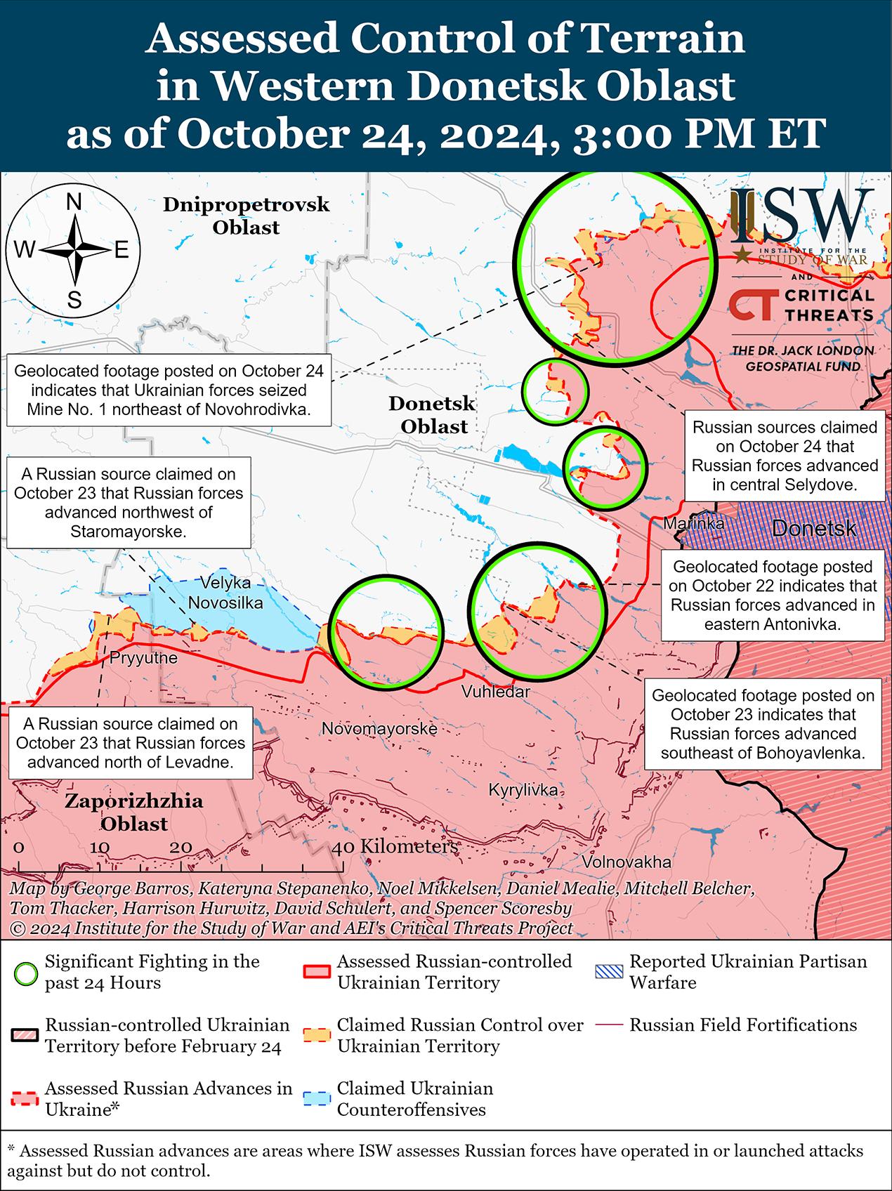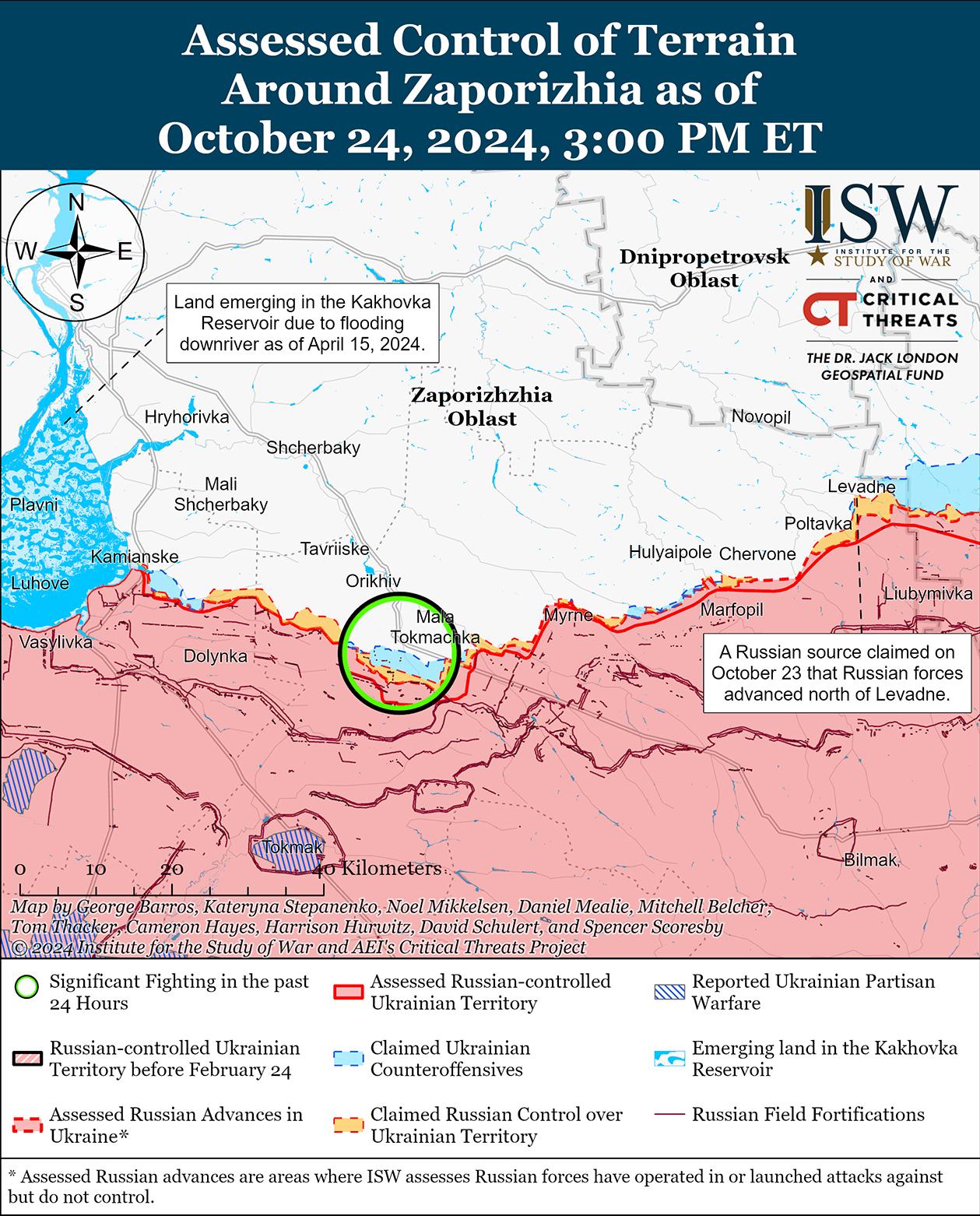 23 и 24 октября российские войска продолжили атаки в западной Запорожской области к северо-востоку от Работино около Новоданиловки, но никаких подтвержденных изменений на линии фронта не было.[60] Российский военблогер заявил 24 октября, что недавние российские успехи на запорожском направлении могут указывать на то, что Россия может начать отдавать приоритет наступательным операциям на запорожском направлении в ближайшем будущем.[61] Военблогер заявил, что российская группировка войск «Днепр», как сообщается, создала несколько новых бригад в оккупированной Херсонской области и что российские войска могут усилить наступательные операции на запорожском направлении, если российские войска продолжат подрывать как украинские резервы в Курской области, так и украинский моральный дух на других участках линии фронта. Российский военблогер заявил, что необходимость наступать по открытым полям и ухудшающиеся погодные условия в Запорожской области могут вызвать трудности для российских операций на этом направлении. Другой российский военблогер заявил 24 октября, что украинские силы активизируют использование беспилотников с видом от первого лица (FPV), разведывательных беспилотников и гексакоптеров для нанесения ударов по позициям российской артиллерии на запорожском направлении.[62]