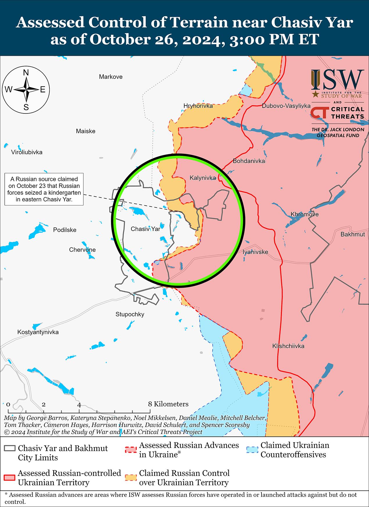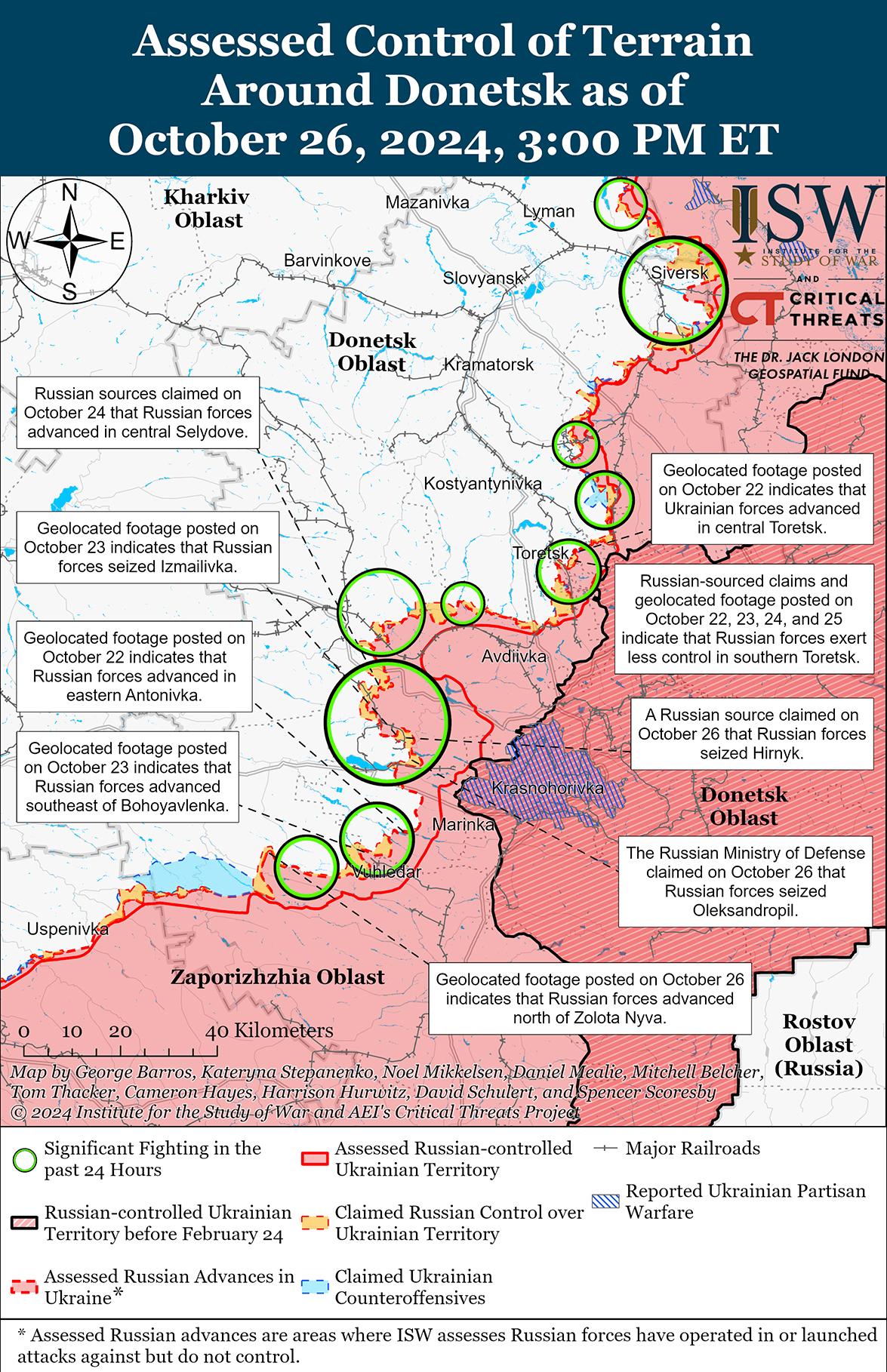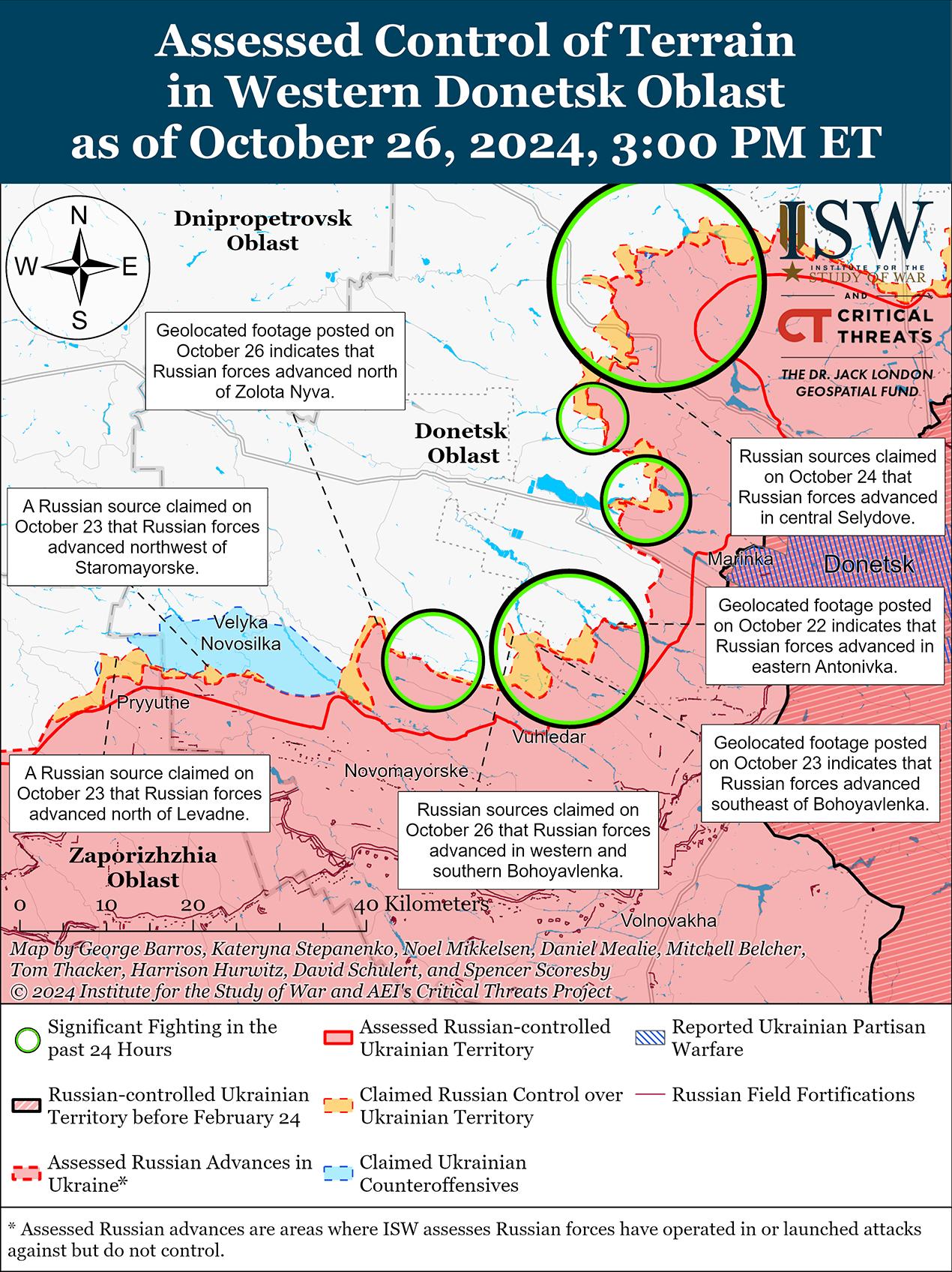 Российские войска недавно продвинулись к юго-востоку от Донецка в районе Угледара на фоне продолжающихся наступательных операций в этом районе 26 октября. Геолокационные кадры, опубликованные 26 октября, показывают, что российские войска продвинулись к западу от Победы (к юго-западу от Донецка).[35] Геолокационные кадры, опубликованные 26 октября, показывающие российскую атаку усиленного взвода и еще одну российскую атаку сокращенной роты, указывают на то, что российские войска недавно продвинулись к северу от Золотой Нивы и к северу и северо-западу от Пречистовки (оба к западу от Угледара). [36] Российские военблогеры утверждают, что российские войска продвинулись в южной и западной части Богоявленки (к северу от Угледара), достигли окраин Новоукраинки (к северо-западу от Угледара) и закрепились на юго-восточной окраине Шахтерского (к северо-западу от Угледара), хотя ISW не обнаружил визуальных доказательств этих заявлений.[37] Российские войска продолжали атаковать юго-западнее Донецка и северо-восточнее Угледара в районе Антоновки, Елизаветовки и Катериновки, а также севернее Угледара в районе Богоявленки 25 и 26 октября.[38] Сообщается, что подразделения российской 14-й бригады спецназа (спецназ Главного управления Генерального штаба Вооруженных сил России [ГРУ]) действуют в районе Богоявленки; а подразделения российской 40-й бригады морской пехоты (Тихоокеанский флот, Восточный военный округ [ВВО]) действуют в районе Золотая Нива-Пречистовка.[39]