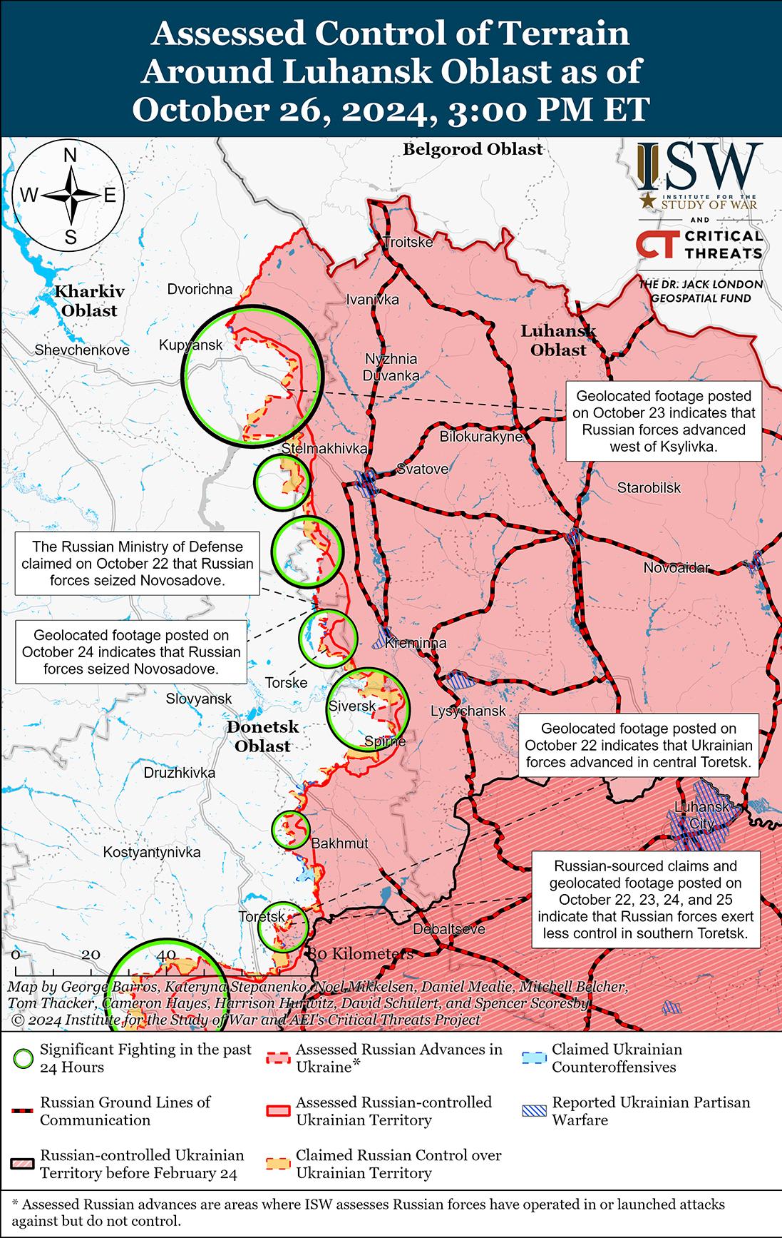 26 октября враг продолжил наступательные действия на линии Купянск – Сватово – Кременная, но подтвержденных успехов не достиг. Российский военный блогер заявил, что российские войска продвинулись к югу от Купянска в районе Колесниковки и Крутяковки; юго-восточнее Купянска в районе Вишневого; и к северо-западу от Кременной в районе Тернов, хотя в ISW не обнаружили визуальных доказательств этих заявлений. [16] Российские войска продолжили атаки к северо-востоку от Купянска в районе Синьковки; к северу от Купянска в районе Голубовки и Кондрашовки; к югу от Купянска в районе Крутяковки; юго-восточнее Купянска в районе Степной, Новоселовки и Вишневого; к западу от Сватово у Першотравневого; к северо-западу от Кременной в районах населенных пунктов Терны, Грековка, Невское и Макеевка; к западу от Кременной у Торского; к югу от Кременной в районе Григорьевки; и юго-западнее Кременной в районе Серебрянки и Серебрянского лесничества 25 и 26 октября.[17]