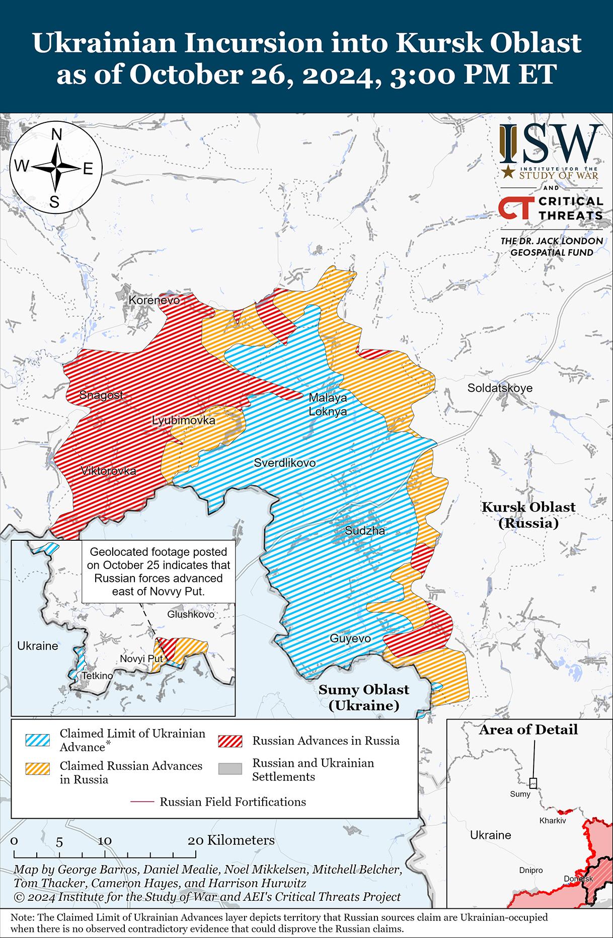 26 октября украинские и российские войска продолжили боевые действия на главном выступе Украины в Курской области, но линия фронта не изменилась. Российские источники, в том числе Министерство обороны России, утверждали, что бои продолжаются к юго-востоку от Коренево в районе Новоивановки, Любимовки и Зеленого Шляха; севернее Суджи в районе Камышовки; северо-западнее Суджи в районе Погребок и Малой Локни; и южнее Суджи у Плехово 25 и 26 октября. [11] Российские военные блогеры утверждали, что украинские войска продолжают действовать в Дарьино (к юго-востоку от Коренево). [12] Подразделения 137-го полка ВДВ (106-я дивизия ВДВ) продолжали действовать в районе Любимовки и Зеленого Шляха. [13]