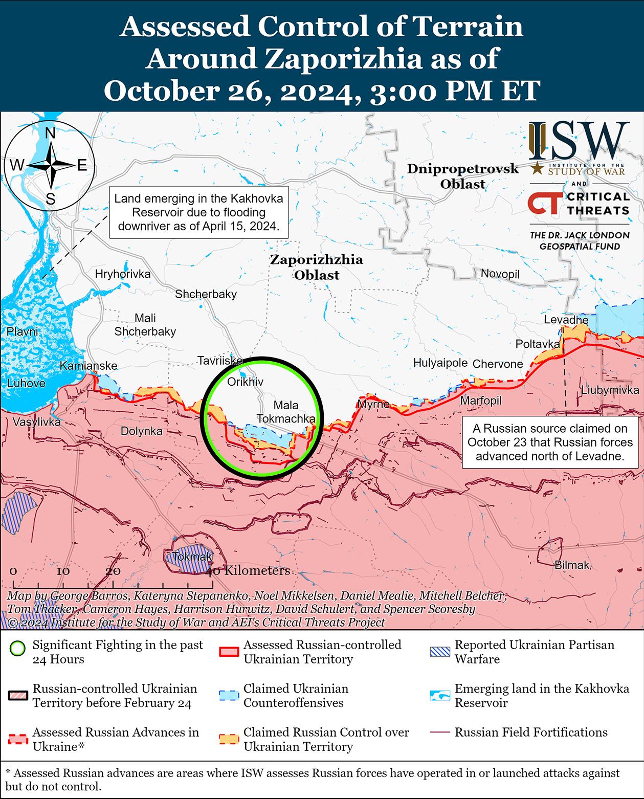 Сообщается, что 26 октября российские войска атаковали к северу от Работино в направлении Новоданиловки. [40] Сообщается, что новобранцы 1430-го мотострелкового полка (58-я общевойсковая армия [ОА], Южный военный округ [ЮВО]) проходят учения на Запорожском направлении; сообщается, что на Запорожском направлении действуют операторы беспилотников 150-го отдельного противотанкового артиллерийского дивизиона (42-я мотострелковая дивизия, 58-я ОА). [41]