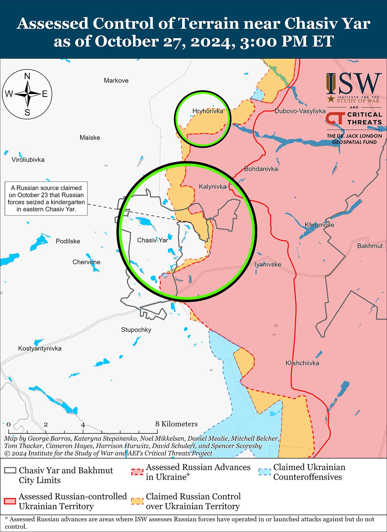 В Генштабе сообщили, что 27 октября российские войска провели безуспешное наземное наступление в районе Орехово-Васильевки (северо-восточнее Часова Яра). [22] Сообщается, что подразделения 98-й воздушно-десантной дивизии (ВДВ) действуют в районе Часова Яра. [23]