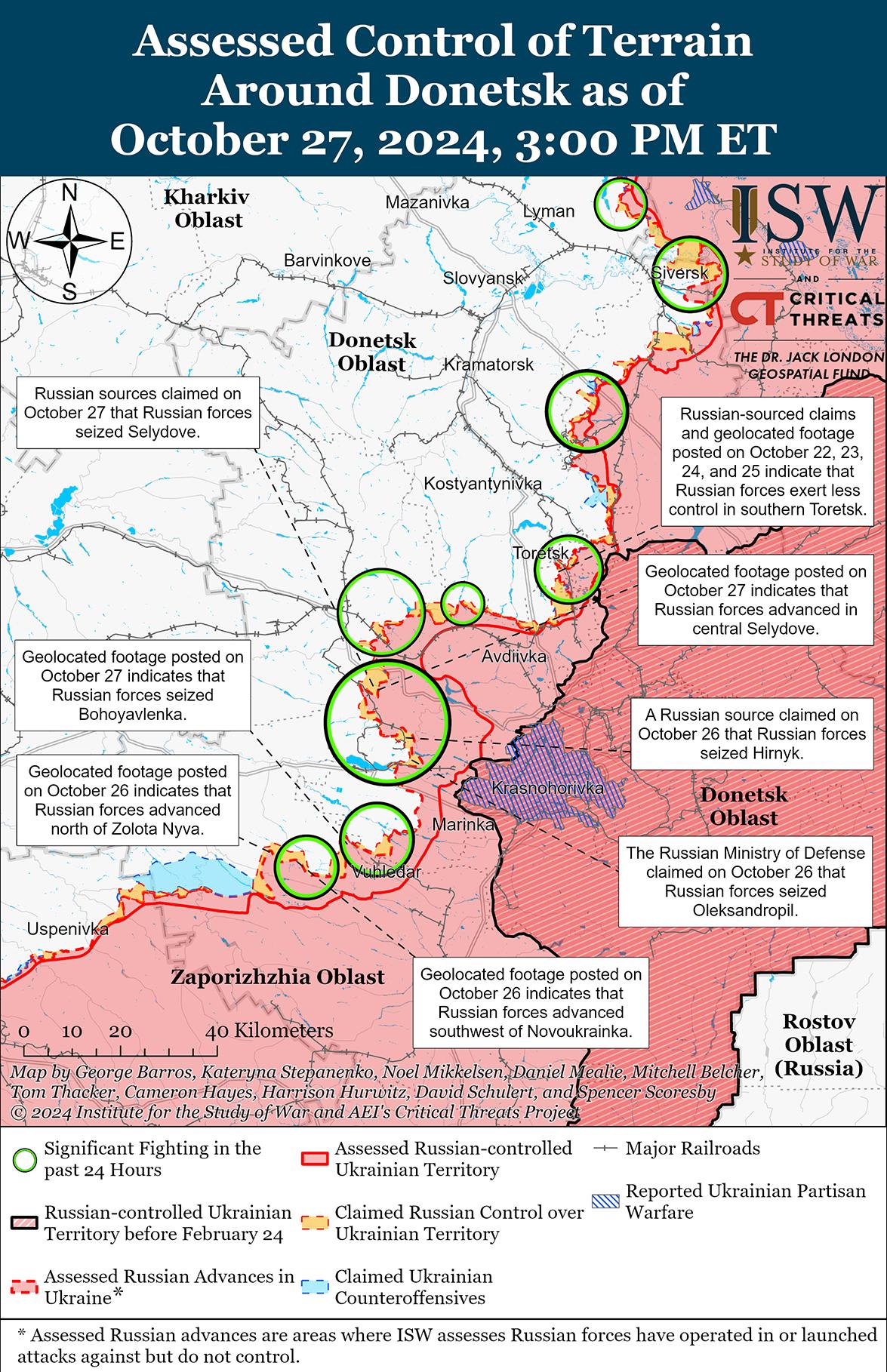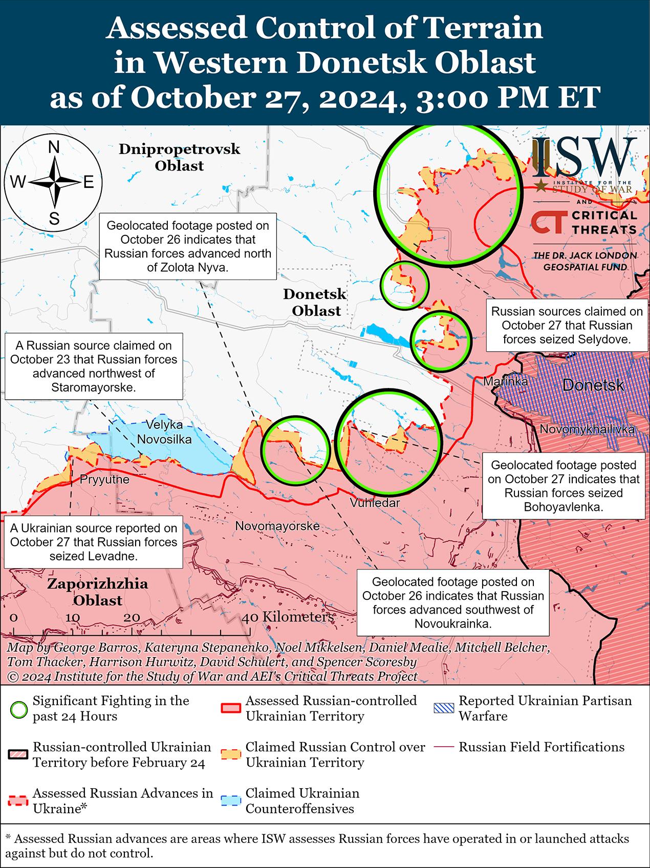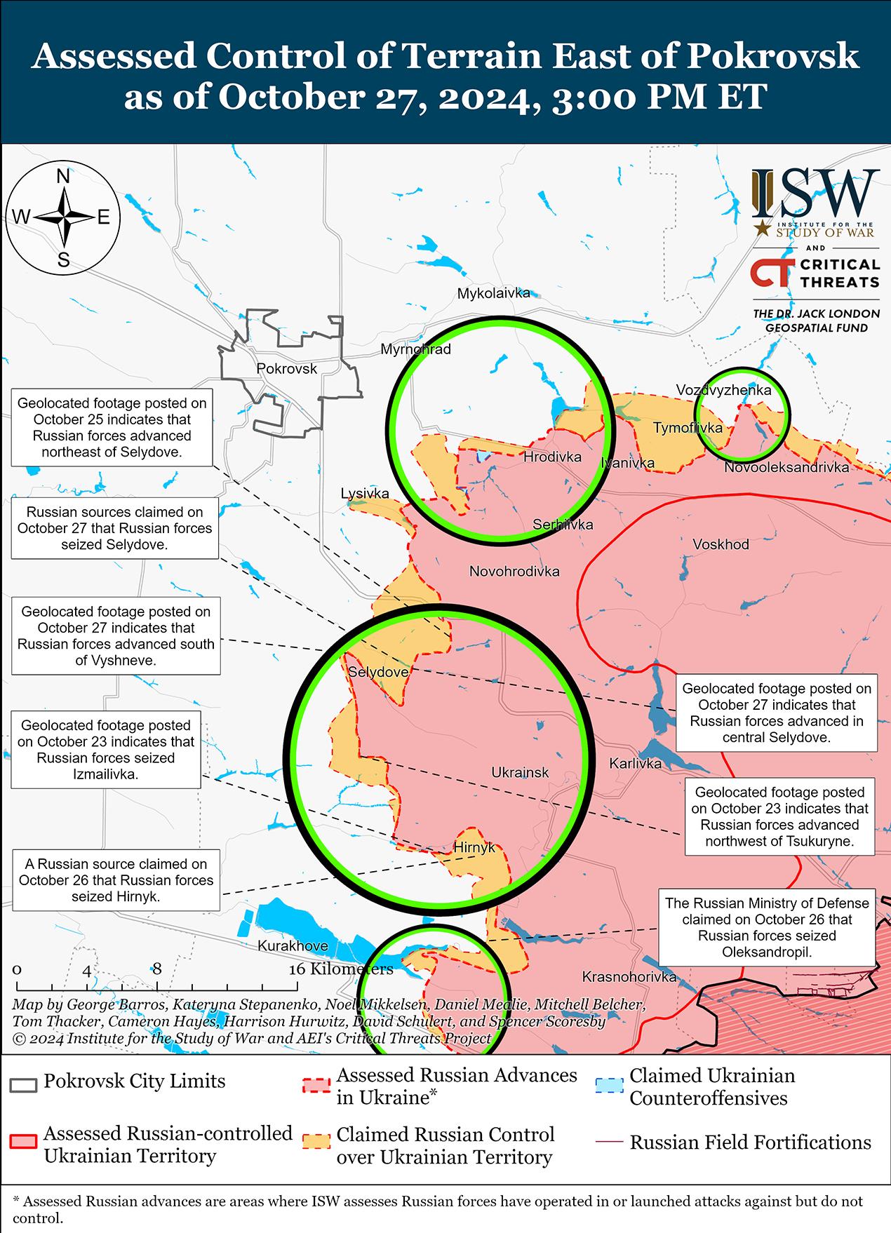 Российские войска продолжили продвижение в Селидово и вблизи него на фоне продолжающихся интенсивных наступательных действий к юго-востоку от Покровска. На геолоцированных кадрах, опубликованных 27 октября, видно, как российские войска поднимают флаг над зданием городского совета Селидово, что указывает на то, что российские войска продвинулись в центральную часть Селидово. [26] Несколько российских военных блогеров утверждали, что российские войска захватили и зачищают всю территорию Селидово, хотя ISW пока не зафиксировал подтверждений действий российских войск в западном Селидово. [27] На геолоцированных кадрах, опубликованных 27 октября, также видно, что в последнее время российские войска продвинулись к югу от Вишневого (к западу от Селидово). [28] Некоторые российские источники утверждают, что российские войска также продвинулись в Вишневое, хотя ISW пока не зафиксировал подтверждения действий российских войск в Вишневом. [29] Генеральный штаб Украины сообщил, что российские войска атаковали к востоку от Покровска в районе Проминя, Миролюбовки и Воздвиженки; и юго-восточнее Покровска в районе Красного Яра, Крутого Яра, Николаевки, Лысовки и Селидово 26 и 27 октября. [30] Сообщается, что подразделения российской 114-й мотострелковой бригады (51-я ОА, бывший 1-й АК Донецкой Народной Республики [ДНР]) действуют в районе Горняка (к юго-востоку от Покровска), а подразделения 1453-го мотострелкового полка (51-я ОА) – в Селидово. [31] Сообщается, что на генеральном Покровском направлении действуют подразделения 74-й отдельной мотострелковой бригады (41-я ОА, Центральный военный округ [ЦВО]). [32]