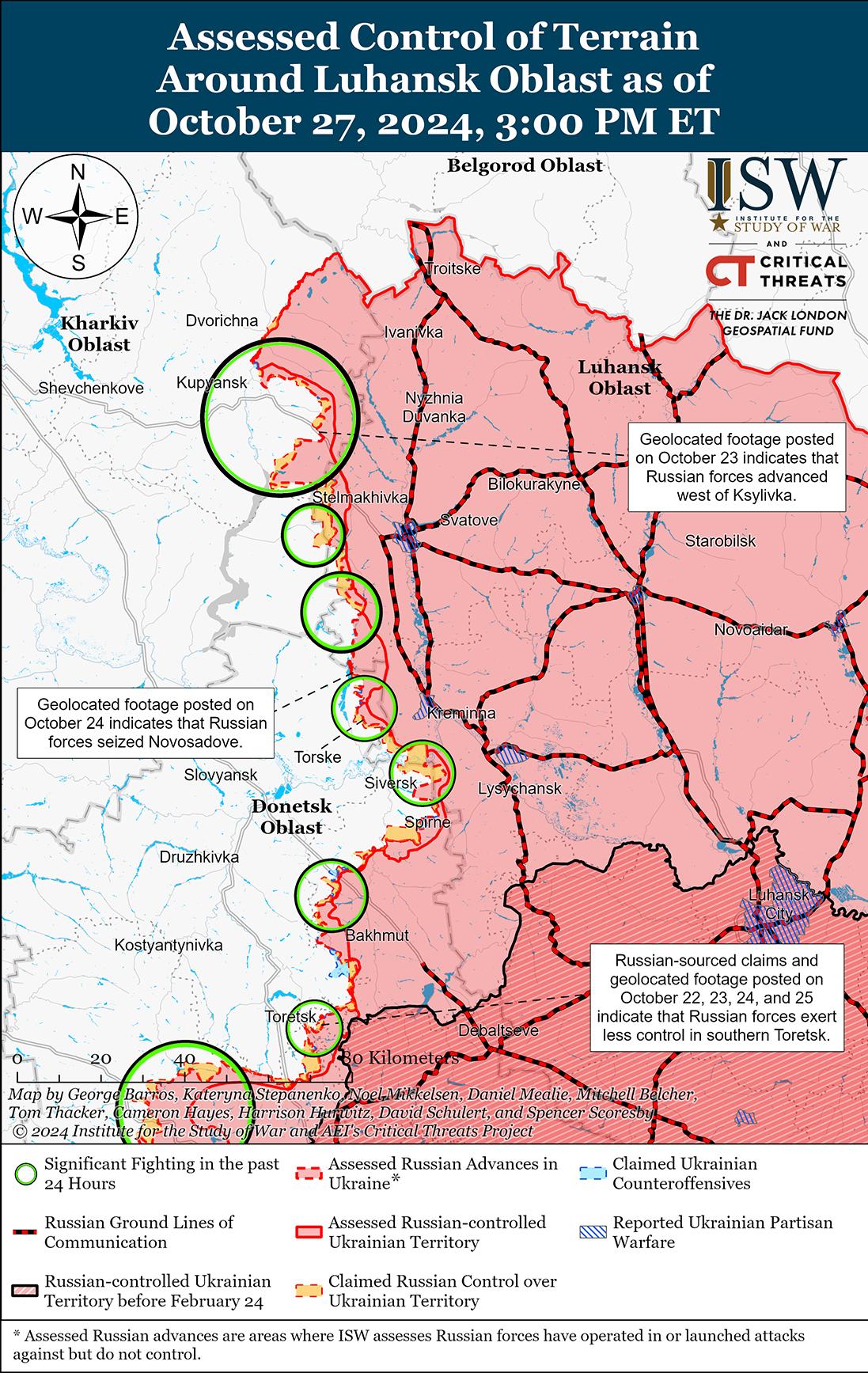 27 октября враг продолжил боевые действия на линии Купянск – Сватово – Кременная, но подтвержденных успехов не достиг. На геолоцированных кадрах, опубликованных 26 октября, видно, как украинские войска успешно отбивают российскую механизированную атаку силой до взвода к северо-востоку от Торского (к западу от Кременной). [14] Российский военный блогер заявил, что неназванные подразделения российского спецназа действуют в районе Сеньковое (к югу от Купянска на западном берегу реки Оскол), хотя ISW не обнаружил никаких визуальных или независимых подтверждений того, что российские войска форсировали реку Оскол. [15] Российские военные блогеры утверждали, что российские войска продвинулись в районе Першотравневого (к западу от Сватово) и к северным окраинам Терны (к западу от Кременной). [16] Командир украинского батальона, действовавший на Купянском направлении, заявил, что российские войска усиливают удары планирующими бомбами по Купянску и восточному (левому) берегу реки Оскол в попытке закрепиться на левом берегу реки Оскол и штурмовать Купянск-Узловой (к югу от Купянска). [17] Украинский командир заявил, что две недели назад украинские войска отразили российский механизированный штурм усиленного батальона на Купянском направлении, что может относиться к российскому наступлению, начатому усиленным батальоном на Купянском направлении 26 сентября. [18] Российские войска продолжили атаки к северо-востоку от Купянска в районе Синьковки; к северу от Купянска в районе Кондрашовки; южнее Купянска в районах Крутяковки, Колесниковки, Загризово; юго-восточнее Купянска в районе Вишневого, Лозовой и Берестового; восточнее Купянска в районе Петропавловки; к западу от Сватово у Першотравневого; к северо-западу от Кременной в районах населенных пунктов Черещина, Терны, Грековка, Новомихайловка и Макеевка; к югу от Кременной в районе Григорьевки; к западу от Кременной у Торского и Заречного; и юго-западнее Кременной в районе Серебрянки 26 и 27 октября. [19]