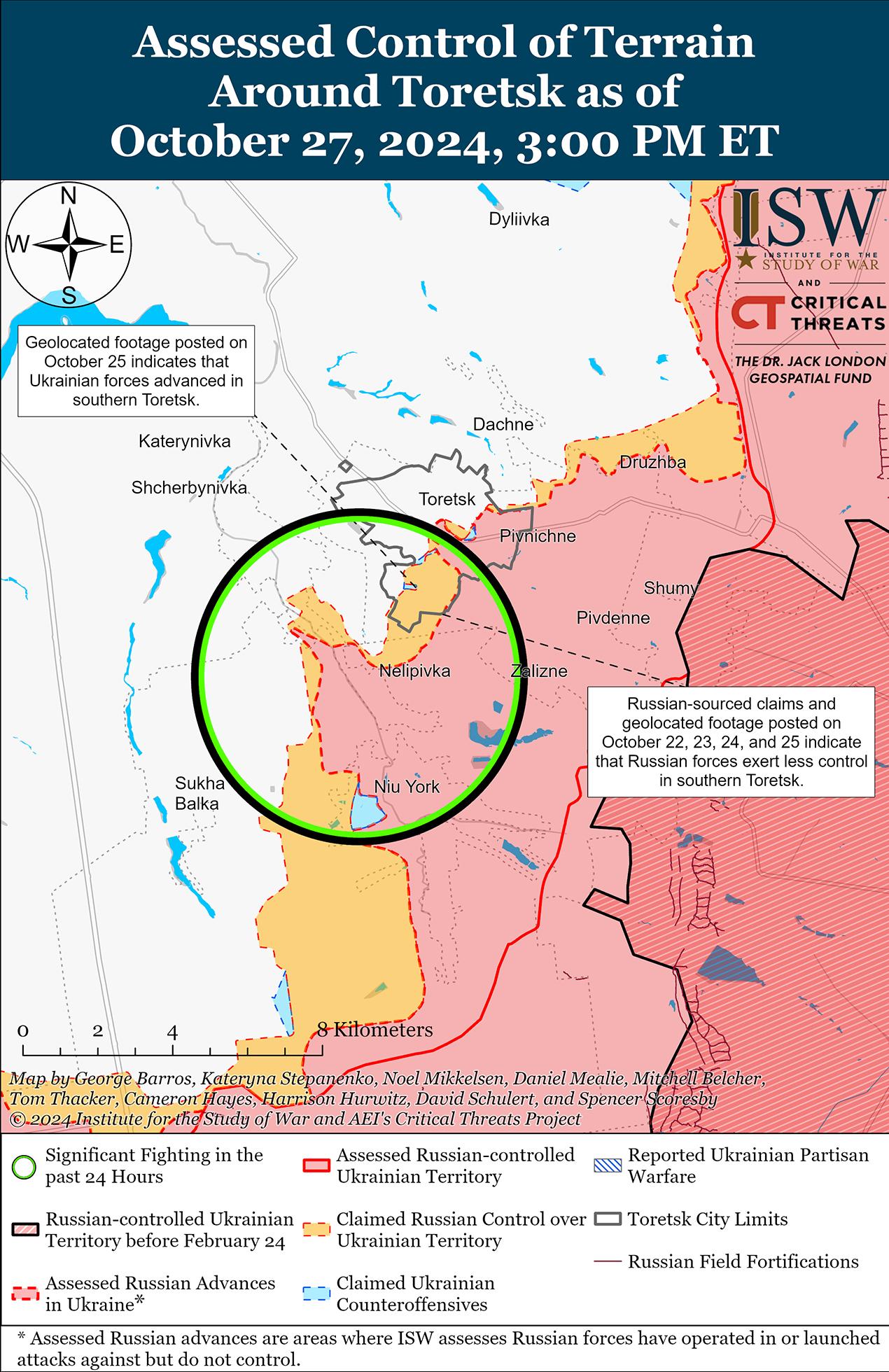 27 октября враг продолжил наступательные действия на Торецком направлении, но не продвинулся вперед. Российские и украинские источники сообщали о продолжающихся боях в самом Торецке; к югу от Торецка в районе Нью-Йорка; и западнее Торецка в районе Щербиновки. [24] Президент России Владимир Путин заявил 27 октября, что российские войска контролируют две трети (67 процентов) Торецка, хотя ISW наблюдал только визуальные доказательства, позволяющие оценить, что российские войска оккупируют около 23 процентов города. [25]