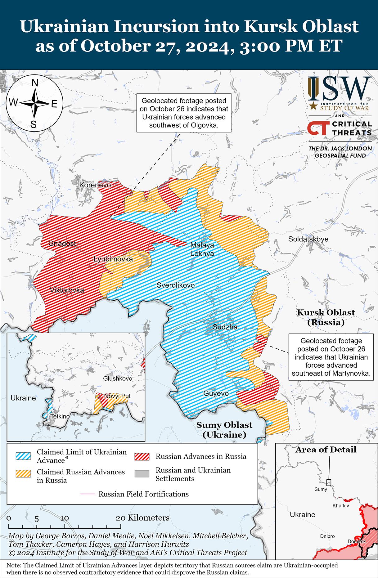 В последнее время украинские войска продвинулись в пределах основного украинского выступа в Курской области на фоне продолжающихся украинских наземных атак в этом районе 27 октября. Геолоцированные кадры, опубликованные 26 октября, свидетельствуют о том, что украинские войска в последнее время продвинулись к юго-западу от Ольговки (к востоку от Коренево) и к востоку от Колмакова (к востоку от Суджи). [6] Российские источники, в том числе Министерство обороны (МО), заявили 27 октября, что украинские войска атаковали к юго-востоку от Коренево в районе Зеленого Шляха, Новоивановки, Дарьино, Нижнего Клина, Погребки и Николаево-Дарьино; и юго-восточнее Суджи в районе Плехово. [7]