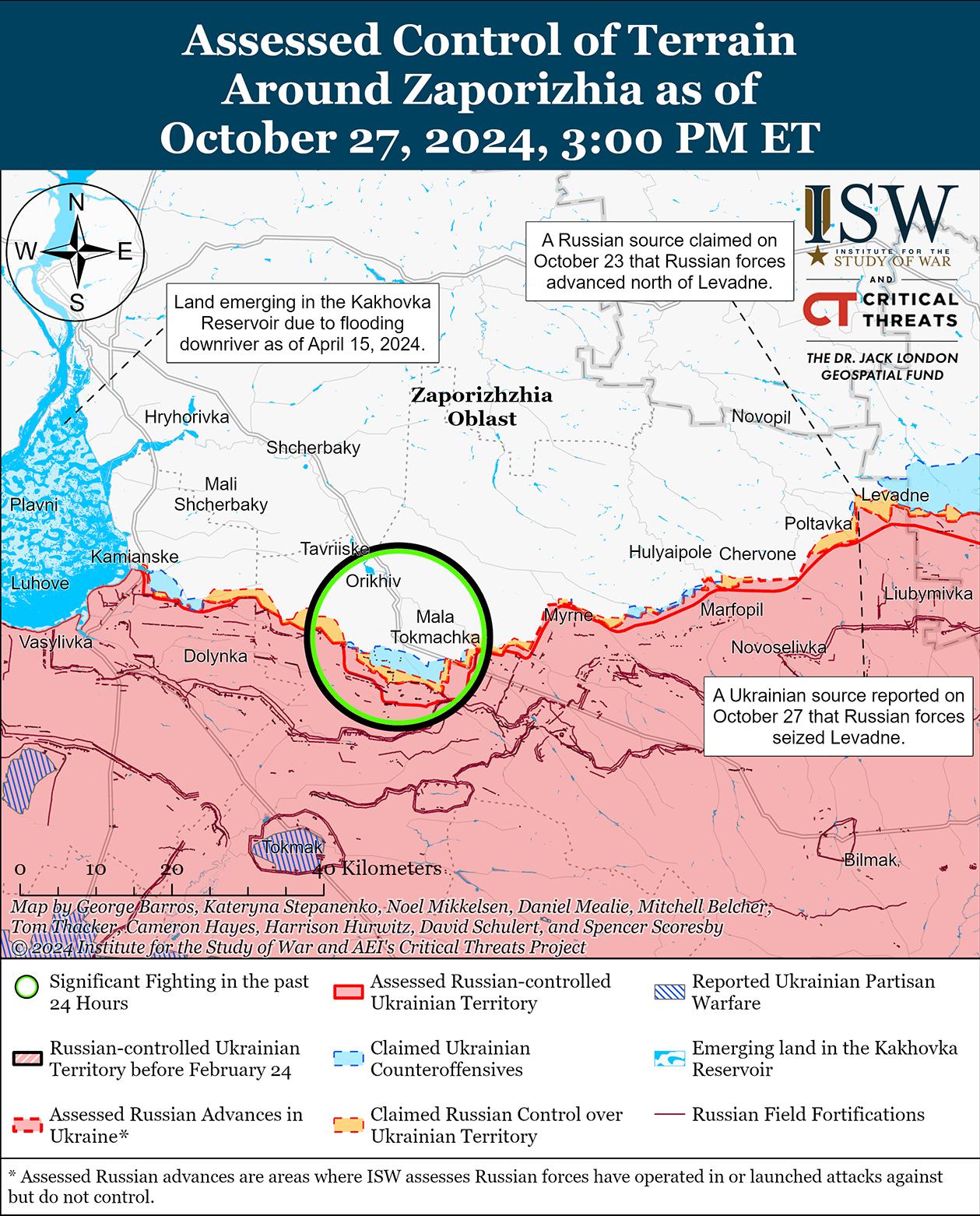Ни российские, ни украинские источники не сообщали о боях на границе Донецкой и Запорожской областей 27 октября. Полковник Владислав Волошин, пресс-секретарь Таврийской группировки войск Украины 27 октября подтвердил, что российским войскам недавно удалось захватить Левадное (к юго-западу от Великой Новоселки), и отметил, что украинские силы предпринимают усилия по восстановлению позиций в этом районе, несмотря на то, что Левадное находится в тактически сложной низменности. [42]