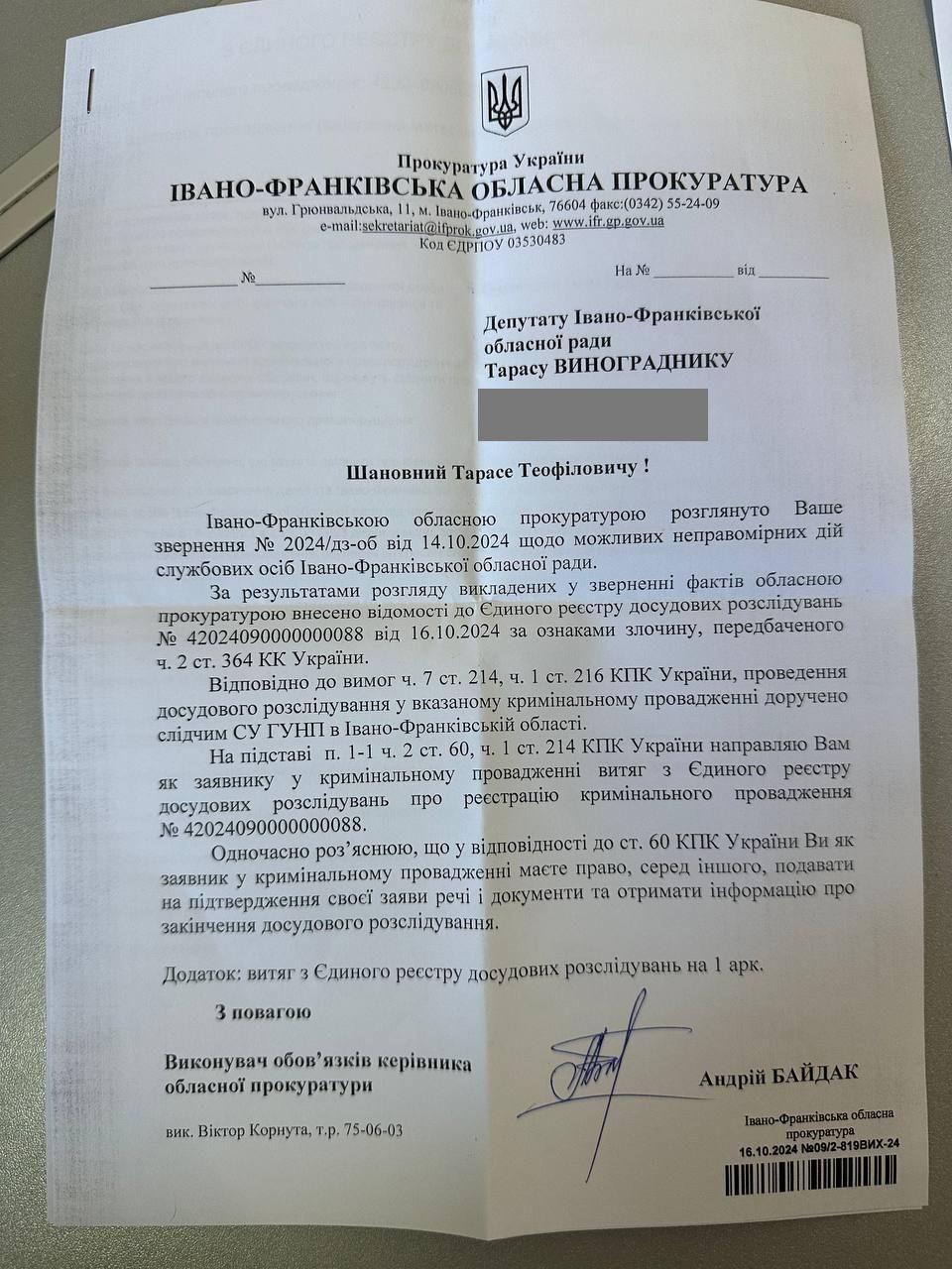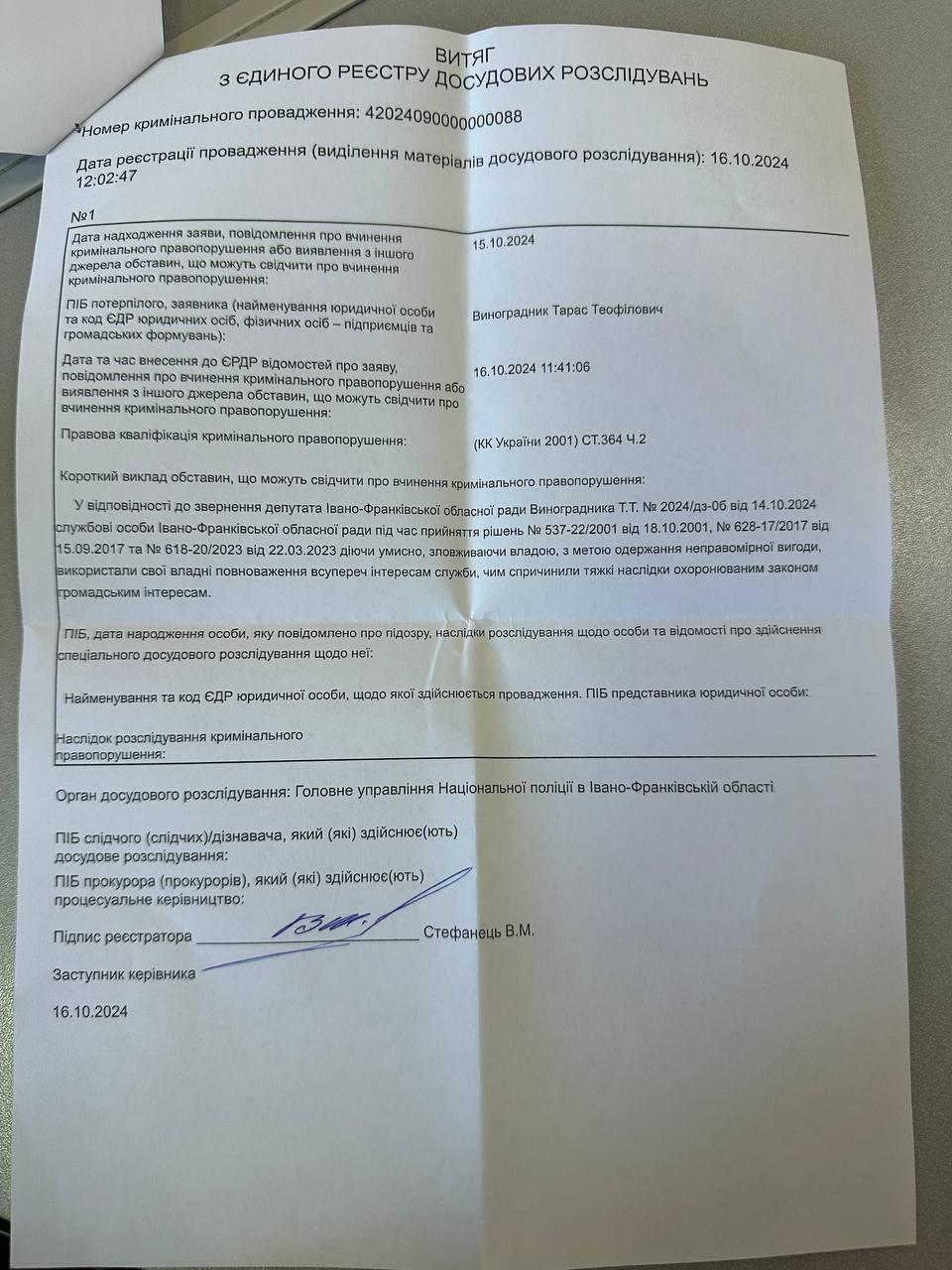 Зазначені у ньому факти прокурори проаналізували і 16 жовтня внесли відомості до Єдиного реєстру досудових розслідувань за ознаками злочину, передбаченого ч.2 ст. 364 Кримінального кодексу України. Для якоїсь там цидулки досить круто!