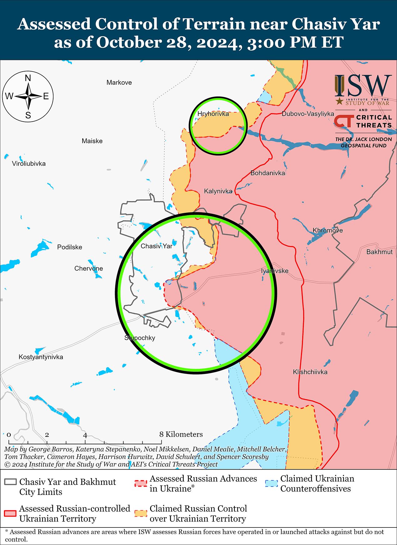 28 октября враг продолжил наступательные действия в районе Часова Яра, однако подтвержденных изменений линии фронта не было. Враг атаковал в районе Часова Яра; северо-восточнее Часова Яра в районе Орехово-Васильевки; и к югу от Часова Яра возле Ступочков и Предтечино 27 и 28 октября. [43] Сообщается, что в районе Часова Яра действуют подразделения российских бригад «Север-В» и «Восток-В», а также операторы беспилотников отряда «Буревестник» (все входят в состав Добровольческого корпуса России). [44]
