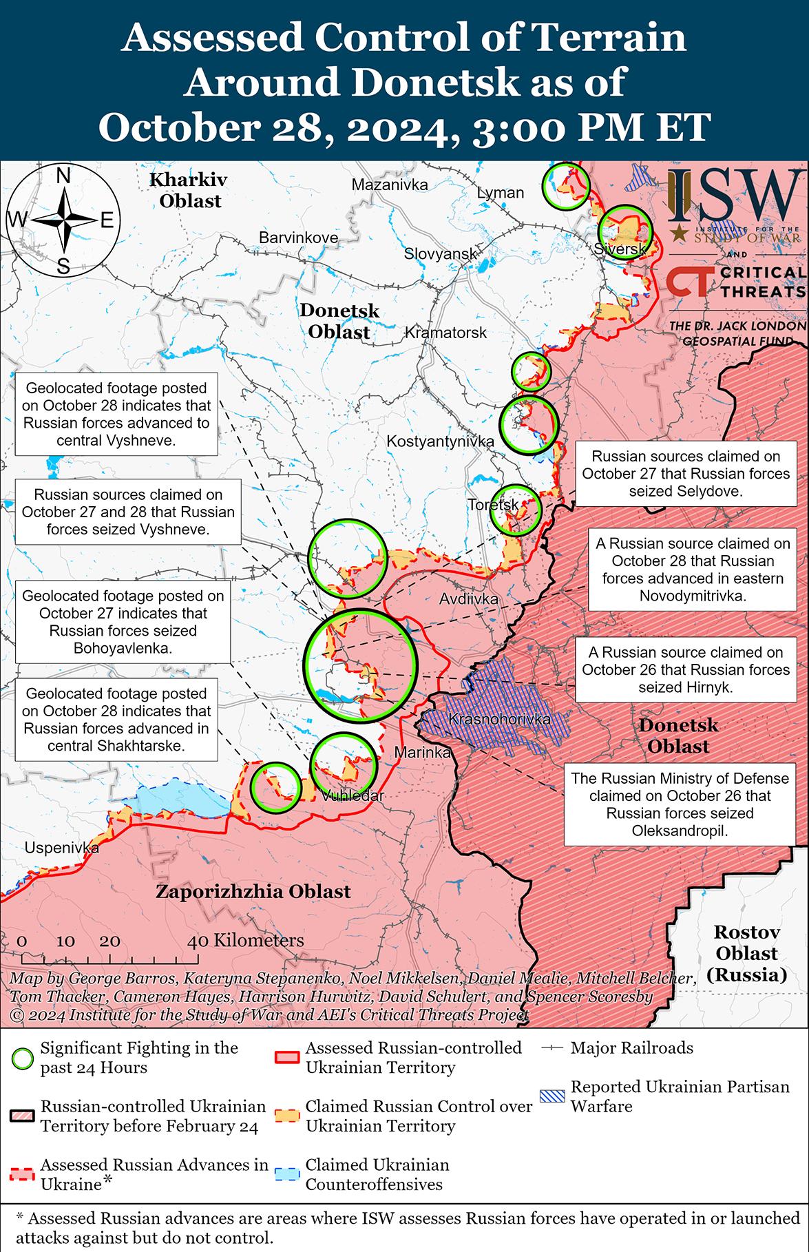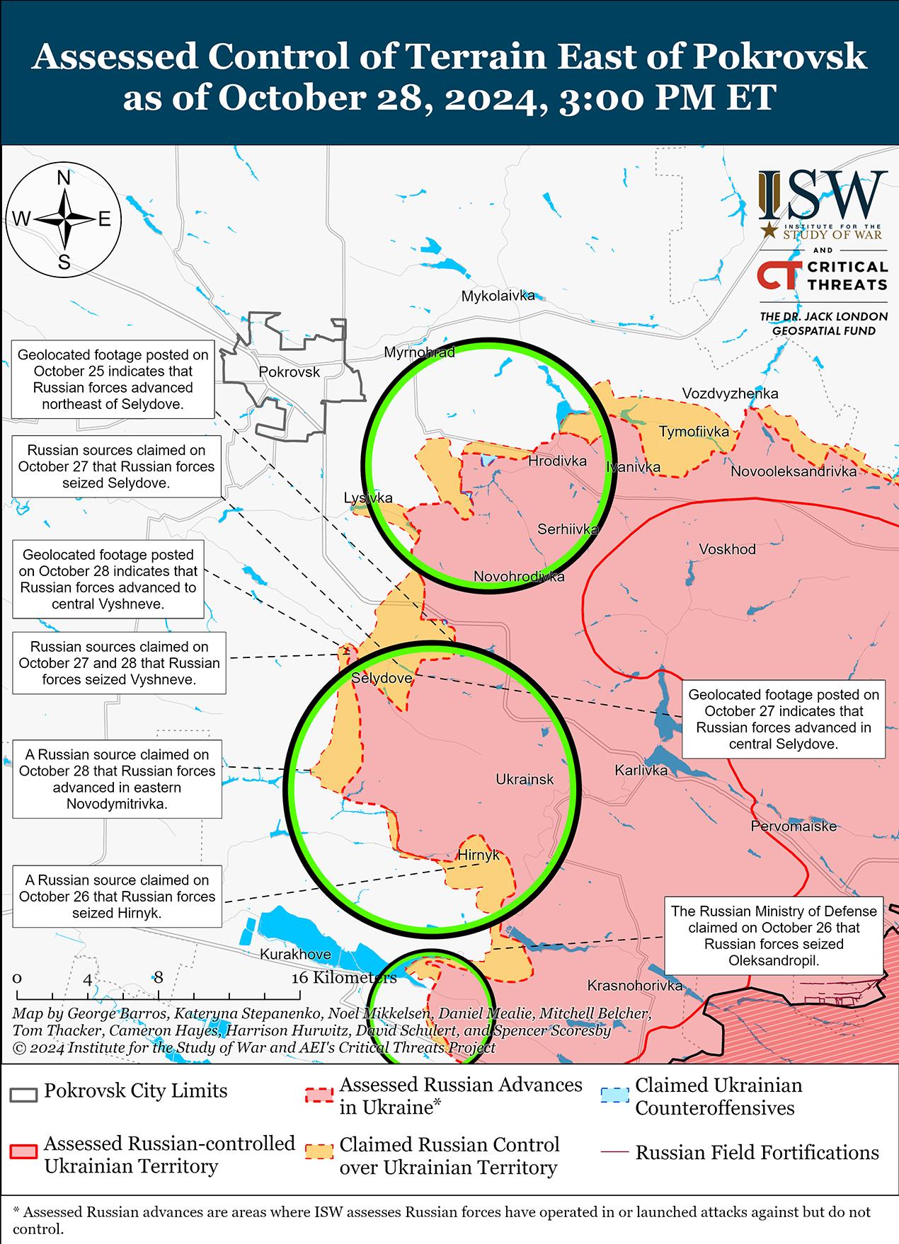 Российские войска недавно продвинулись к юго-востоку от Покровска на фоне продолжающихся наступательных действий в этом районе 28 октября. Геолоцированные кадры, опубликованные 27 и 28 октября, указывают на то, что российские войска недавно продвинулись к северу от Селидово, в центральной части Вишневого и в районе Новодмитровки (все к юго-востоку от Покровска). [49] Министерство обороны России заявило 28 октября, что российские войска захватили Цукурино (к юго-востоку от Селидово), а министр обороны России Андрей Белоусов приписал захват населенного пункта подразделениям российской 114-й мотострелковой бригады (51-й ОА). [50] Российские военные блогеры заявили 28 октября, что российские войска продвинулись к северо-западу от Вишневого и захватили населенный пункт; что русские войска продвинулись к юго-западу от Вишневого; и что российские войска продвинулись к востоку от Кременной Балки (к югу от Селидово), но ISW не обнаружил подтверждения этих заявлений. [51] 27 и 28 октября враг продолжил атаки к востоку от Покровска в районе Миролюбовки, Проминя и Крутого Яра и к юго-востоку от Покровска в районе Селидово, Новодмитровки, Кураховки, Новоселидовки, Цукурино и Вишневого. [52] Командир украинской роты, действовавшей в районе Селидово, заявил 27 октября, что российские войска «могут себе позволить» перебрасывать 600 военнослужащих в неделю для проведения пехотных атак в Селидово и что у российских войск, по-видимому, достаточно резервных сил для постоянного ведения штурмов в этом районе. [53] Представитель украинской бригады, действующей вблизи Селидово, заявил, что российские войска перебросили личный состав из северной части Покровского направления в район Селидово для поддержки пехотных атак.[54] Представитель также заявил, что российские войска реже наносят артиллерийские удары и предпочитают наносить точные удары с помощью беспилотников с видом от первого лица (FPV), прикрепленных к разведывательному беспилотнику и сбрасываемых с него. Сообщается, что в Селидово действуют подразделения российской 90-й танковой дивизии (41-я ОА, Центральный военный округ [ЦВО]), 30-го отдельного разведывательного батальона (90-я гвардейская танковая дивизия, 41-я ОА, ЦВО) и российской 71-й отдельной бригады спецназа; и, как сообщается, в районе Вишневого действуют подразделения российского отряда «Черные гусары» 15-й мотострелковой бригады (2-я ОА, ЦВО) и добровольческого отряда «БАРС-Сармат» (боевой армейский резерв страны).[55]