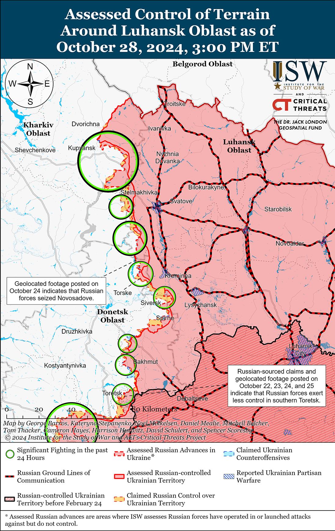 28 октября российские войска незначительно продвинулись к юго-востоку от Купянска на фоне продолжающихся наступательных операций вдоль линии Купянск-Сватово-Кременная. Геолоцированные кадры, опубликованные 27 и 28 октября, свидетельствуют о том, что российские войска в последнее время незначительно продвинулись к юго-востоку от Купянска в районе Колесниковки и к юго-западу от Кругляковки. [39] Российские военные блогеры утверждали, что российские войска продвинулись к востоку от Купянска в районе Песчаного и Степной Новоселовки; южнее Купянска в Загрызово; к северо-западу от Стельмаховки (западнее Сватово); от Новосадово в направлении Терны (оба западнее Кременной); и в Торском (к западу от Кременной). [40] Российские войска продолжили атаки к северо-западу от Купянска в районе Кондрашовки; северо-восточнее Купянска в районах населенных пунктов Сосновка, Петропавловка и Першотравневое; к юго-востоку от Купянска в районах населенных пунктов Колесниковка, Крутяковка и Загрызово; к западу от Сватово в районе Лозовой и Вишневого; к юго-западу от Сватово в районах населенных пунктов Грековка, Чернещина, Новомихайловка, Макеевка; к западу от Кременной у Заречного, Терны и Торское; и к юго-западу от Кременной в районе Серебрянки и Григорьевки. [41] Сообщается, что подразделения российской 16-й бригады спецназа действуют вблизи Петропавловки. [42]