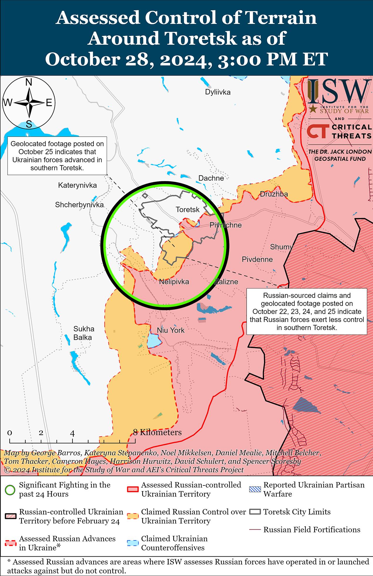 28 октября враг продолжил наступательные действия под Торецком, но подтвержденных изменений на линии фронта не было. 28 октября российский военный блогер заявил, что российские войска продвинулись в центре Торецка, но ISW не обнаружил подтверждения этому заявлению. [45] Российские войска атаковали под Торецком; к югу от Торецка в районе Нью-Йорка; и к западу от Торецка в районе Щербиновки 27 и 28 октября. [46] 28 октября российский военный блогер заявил, что украинские войска контратаковали к северу от улицы Свердлова в Торецке. [47] Сообщается, что на Торецком направлении действуют подразделения российского 56-го отдельного батальона специального назначения (51-я гвардейская общевойсковая армия [ОА], бывший 1-й армейский корпус Донецкой Народной Республики [АК ДНР]). [48]