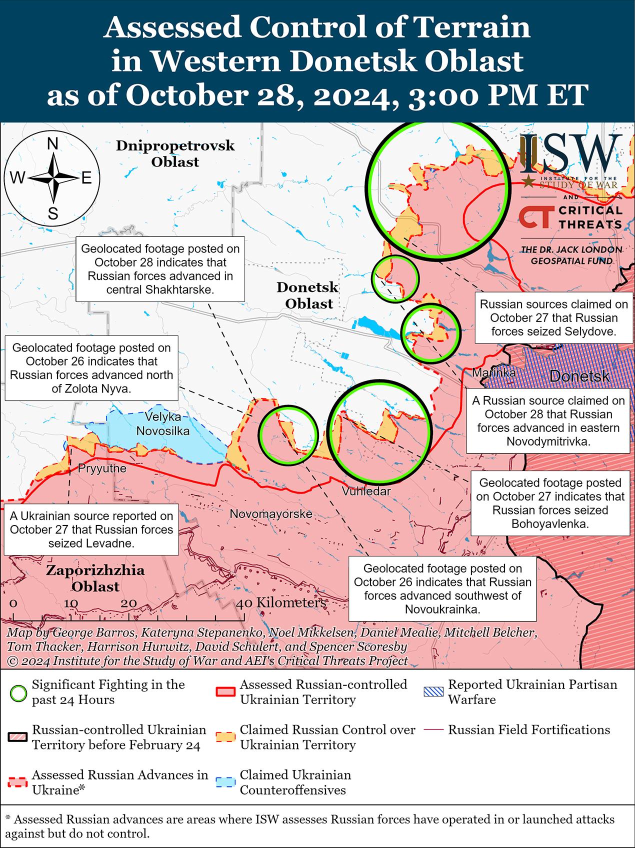 В последнее время российские войска продвинулись к юго-западу от Донецка в районе Угледара на фоне продолжающихся наступательных действий в этом районе. Опубликованные 25 октября геолоцированные кадры, на которых украинские войска отбивают российский усиленный взводный механизированный штурм к юго-западу от Елизаветовки (к северо-востоку от Угледара), указывают на то, что российские войска недавно продвинулись в этом районе. [57] Опубликованные 28 октября дополнительные геолоцированные кадры, на которых украинские войска отбивают российское усиленное танковое наступление к юго-западу от Катериновки (к северо-востоку от Угледара), указывают на то, что российские войска недавно продвинулись в этом районе. [58] Дополнительные геолоцированные кадры, опубликованные 28 октября, указывают на то, что российские войска продвинулись к северо-востоку от Шахтерского (к северо-западу от Угледара). [59] Российские источники утверждали, что российские войска продвинулись вблизи и в пределах Катериновки; у Богоявленки (северо-западнее Угледара), Новоукраинки (северо-западнее Угледара) и Золотой Нивы (западнее Угледара); и в пределах «Шахтерского». [60] Однако ISW не обнаружил визуального подтверждения этих заявлений. Враг продолжил атаки к северо-востоку от Угледара вблизи Катериновки и Антоновки; северо-западнее Угледара в районе Богоявленки, Новоукраинки, Шахтерского; и к западу от Угледара в районе Золотой Нивы 27 и 28 октября. [61] Сообщается, что подразделения российской 39-й мотострелковой бригады и 1472-го мотострелкового полка (оба входят в состав 68-й АК Восточного военного округа) действуют вблизи Катериновки; по сообщениям, подразделения 57-й мотострелковой бригады (5-я ОА, ВВО) действуют в районе Богоявленки; сообщается о действиях подразделений 37-й мотострелковой бригады (36-я ОА, ВВО) в районе Шахтерского; сообщается, что подразделения 60-й мотострелковой бригады (5-я ОА, ВВО) действуют вблизи Макаровки (к западу от Угледара и к югу от Великой Новоселки). [62]