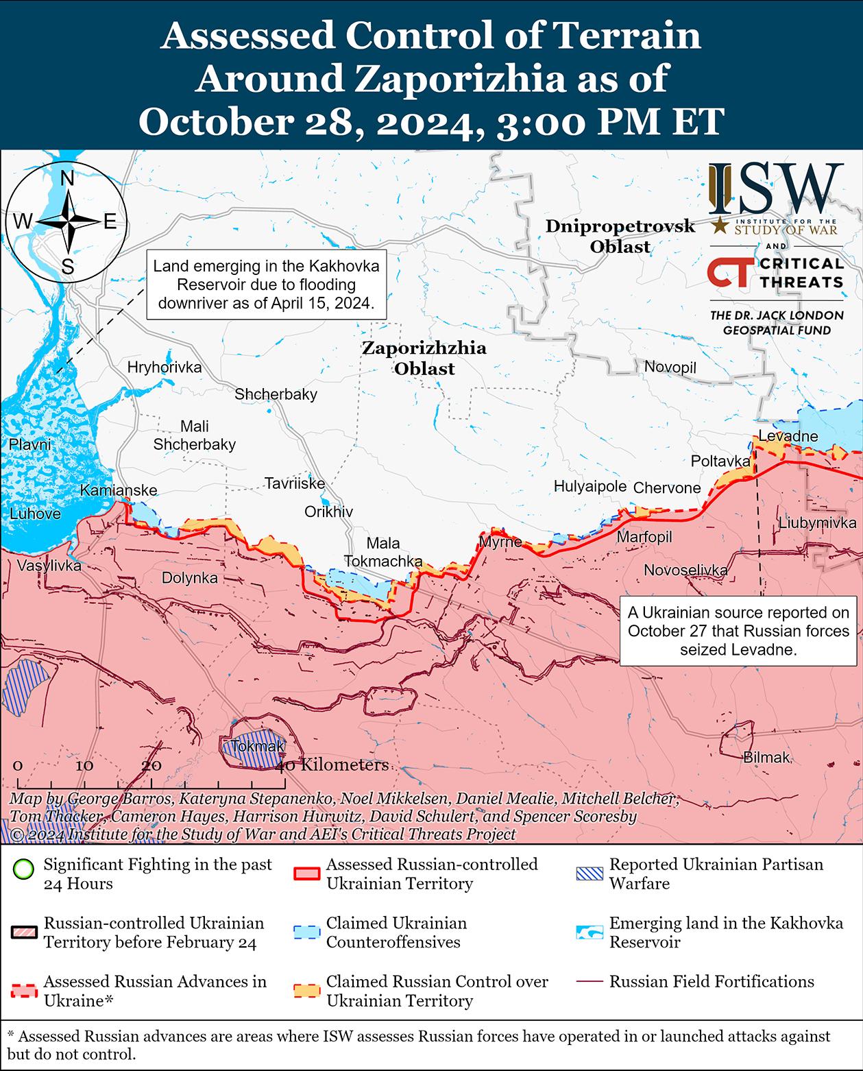 Ни российские, ни украинские источники не сообщали о наземных атаках на западе Запорожской области 28 октября. Сообщается, что подразделения 42-й мотострелковой дивизии России (58-я общевойсковая армия, Южный военный округ) и 49-й отдельной десантно-штурмовой бригады (по сообщениям, подчиненной 58-й ОА, ЮВО) действуют на общем Запорожском направлении и к северо-востоку от Работино в районе Малой Токмачки соответственно. [63]