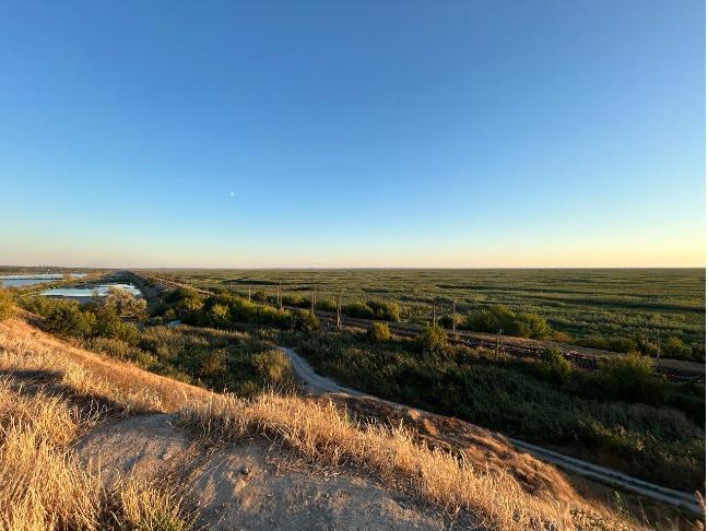 Мы стоим на высоком берегу, под которым ветер волнами ложится на зеленые листья. Почти до горизонта тянется “зеленое море” – бывшее Каховское водохранилище, которое после российского теракта полностью обмелело, и теперь покрыто миллионами молодых ивовых ростков. Вдали виден берег, сейчас оккупированный российской армией. Кое-где вверх поднимается серый дым — места взрывов снарядов. Удаленные звуки обстрелов слышны почти непрерывно.