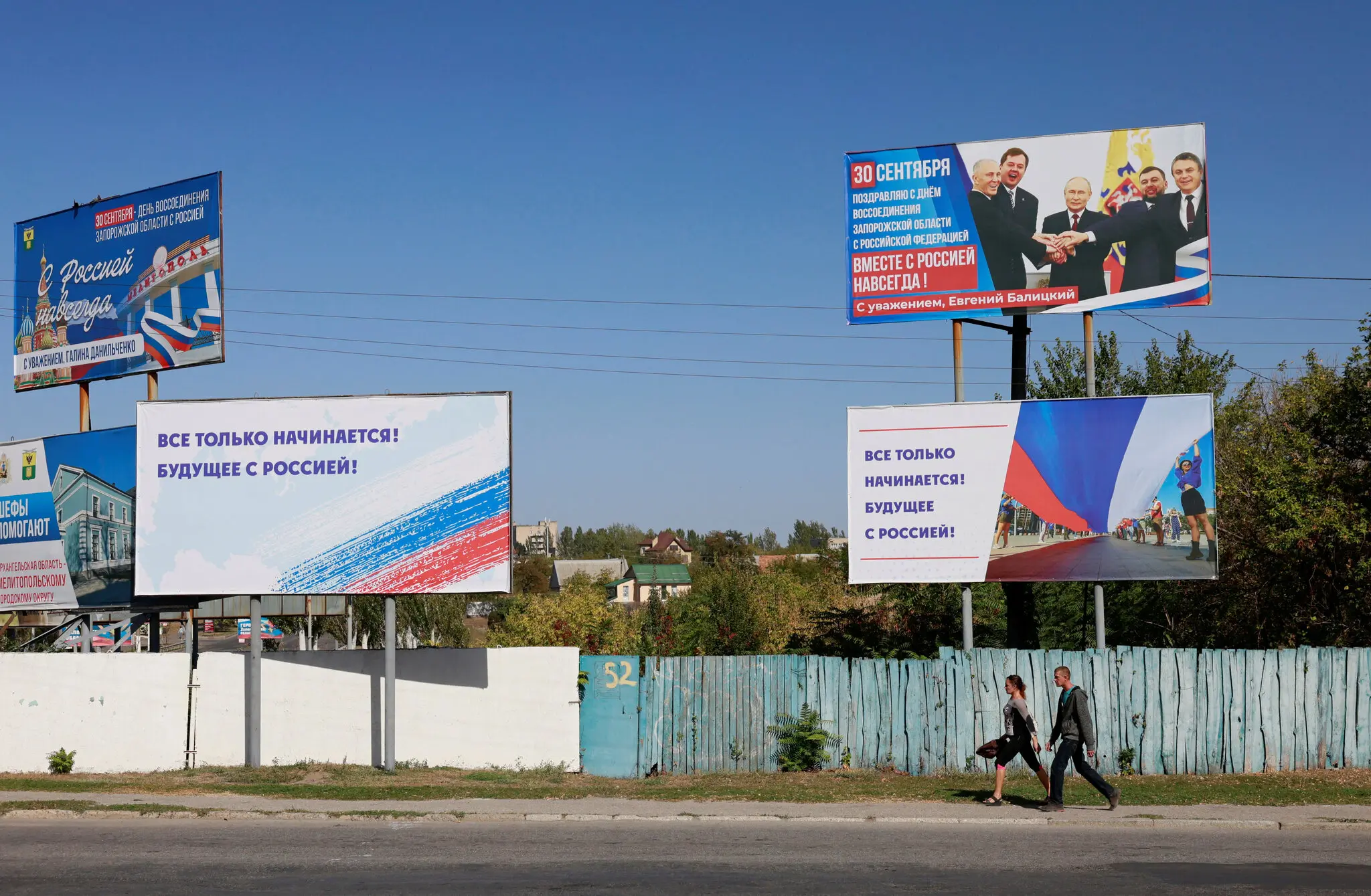 Билборды в Мелитополе, Украина, в этом месяце посвящены годовщине аннексии Россией прилегающей Запорожской области. Фото…Рейтер
