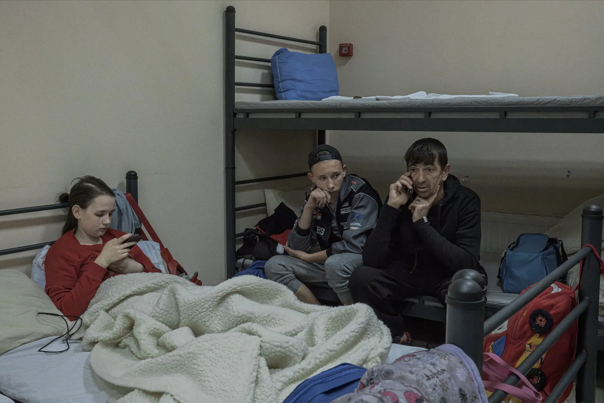 Алексей (справа) с двумя детьми в общежитии для вынужденных переселенцев в Сумах в апреле. Фото…Маурисио Лима для The New York Times