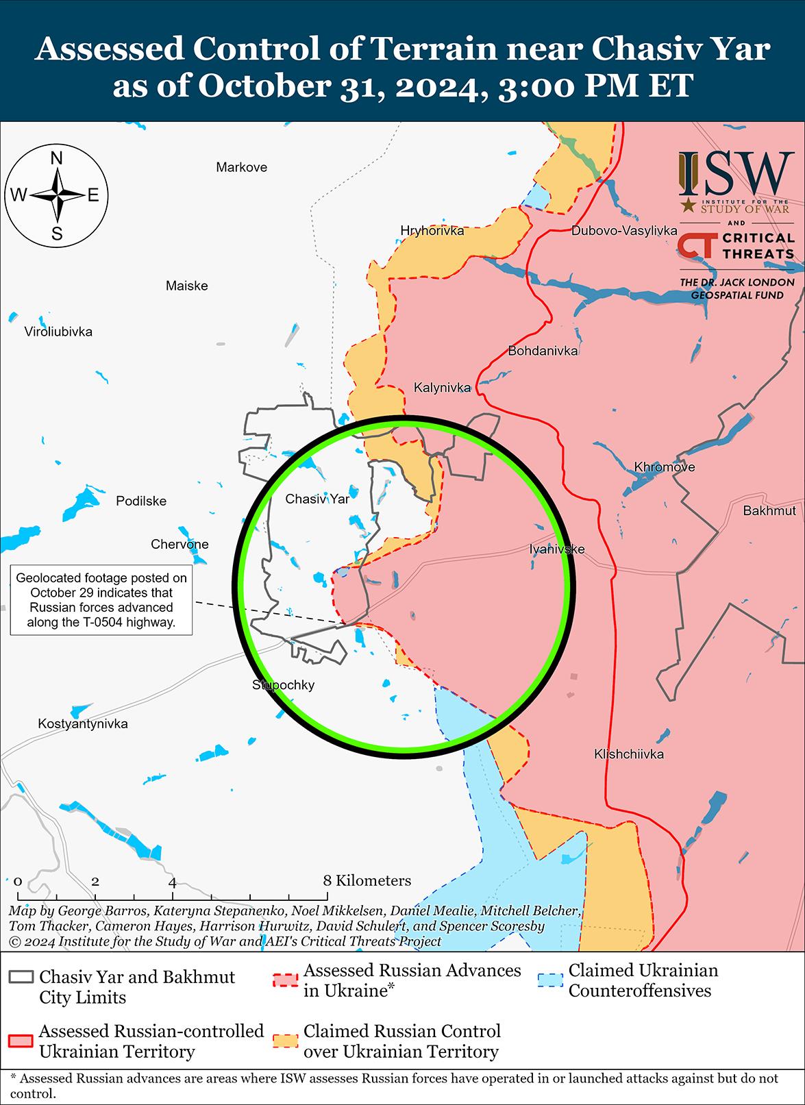 30 и 31 октября враг продолжал наступательные действия в районе Часова Яра, в том числе в микрорайоне Жовтневый на востоке Часова Яра, но не добился подтвержденных успехов. [38] Российские военные блогеры утверждали, что российские войска продвинулись вдоль трассы Т0504 Бахмут – Константиновка к югу от Часова Яра и в двух километрах к востоку от Ступочки (к югу от Часова Яра), но ISW не зафиксировал подтверждения этих заявлений. [39] Представитель украинской бригады, действовавшей в районе Часова Яра, сообщил 31 октября, что небольшие группы российской пехоты иногда пересекают канал Северский Донец-Донбасс, но не могут существенно продвинуться из-за украинских ударов. [40] Один из российских военных блогеров отметил, что из-за дождливой погоды в районе Часова Яра земля превратилась в «непролазную грязь». [41] Сообщается, что подразделения 98-й воздушно-десантной дивизии (ВДВ) действуют в районе Часова Яра. [42]