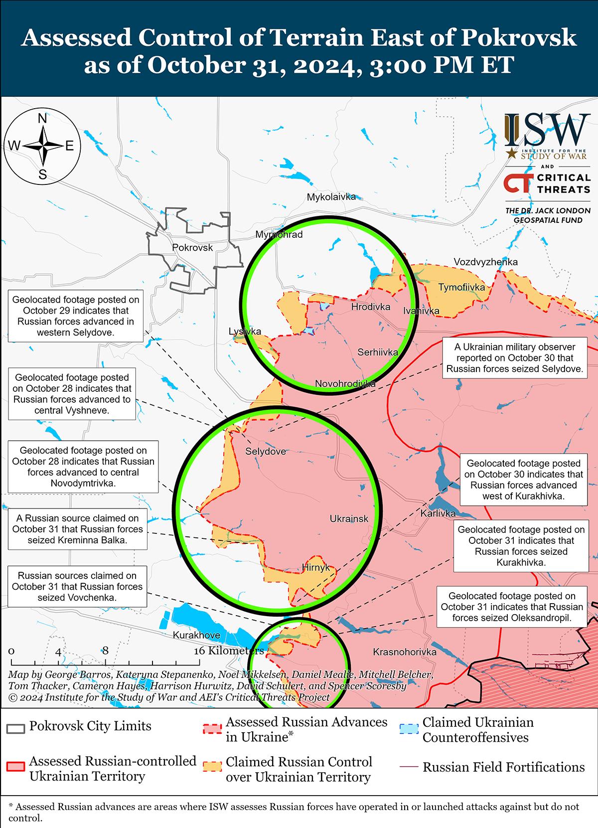 Российские войска незначительно продвинулись к востоку и юго-востоку от Покровска на фоне продолжающихся российских наступательных операций 30 и 31 октября. Геолоцированные кадры, опубликованные 31 октября, свидетельствуют о том, что российские войска в последнее время продвинулись к югу от Новоторецкого (к востоку от Покровска) и к северо-западу от Селидово (к юго-востоку от Покровска). [46] Российские войска продолжали наступление к востоку от Покровска в районе Миролюбовки, Мирнограда и Проминя; южнее Покровска в направлении Новоалексеевки и Григорьевки; и к юго-востоку от Покровска в районе Лысовки, Сухого Яра, Новогродовки, Вишневого, Крутого Яра, Николаевки и Селидово. [47] Представитель украинской бригады, действовавшей на Покровском направлении, сообщил, что российские войска начали использовать багги для перевозки пехоты для штурма и что в зоне ответственности украинской бригады действуют подразделения 74-й мотострелковой бригады (41-я ОА, Центральный военный округ [ЦВО]) и трех других мотострелковых бригад. [48] Глава Покровской городской военной администрации Сергей Добряк сообщил, что украинские власти блокируют некоторые районы города для подготовки обороны, и отметил, что с 2022 года украинские войска строят эшелонированные оборонительные сооружения в Покровске. [49]