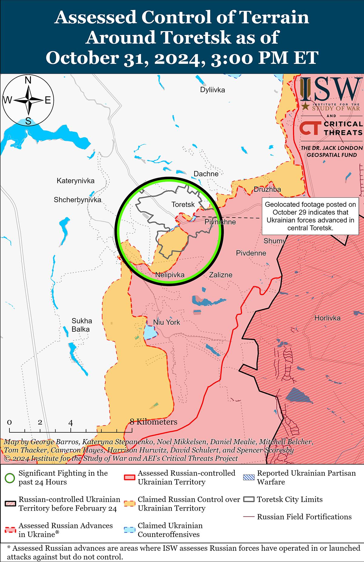 Украинские и российские войска недавно продвинулись к северо-востоку и юго-востоку от Курахово на фоне продолжающихся боев на Кураховском направлении 31 октября. Геолоцированные кадры, опубликованные 31 октября, свидетельствуют о том, что украинские войска недавно отбили позиции в лесистой местности к юго-западу от Победы (к юго-востоку от Курахово). [50] На дополнительных геолоцированных кадрах, опубликованных 31 октября, указано, что подразделения российской 114-й мотострелковой бригады (51-я ОА) продвинулись к юго-западным административным границам Кураховки (северо-восточнее Курахово) и, вероятно, захватили населенный пункт. [51] Российские военные блогеры утверждали, что российские войска также захватили Волченко (к юго-западу от Кураховки), хотя связанный с Кремлем российский военный блогер утверждал, что украинские войска удерживают позиции в населенном пункте. [52] Российские военные блогеры также утверждали, что российская бронетанковая штурмовая группа захватила позиции на окраине Курахово и продвинулась в районе Новодмитровки, Кременной Балки и Вознесенки (все к северу от Курахово); юго-западнее Горняка; к западу от Александрополя (оба к северо-востоку от Курахово); и к западу от Победы (к юго-востоку от Курахово). [53] Однако ISW не обнаружил подтверждения этих заявлений. Враг продолжил наступательные действия к северу от Курахово в районах населенных пунктов Новоселидовка, Новодмитровка, Кременная Балка и Ильинка; северо-восточнее Курахово в районе Кураховки, Вознесенки, Островки и Острого; и к востоку от Курахово в районе Максимильяновки 30 и 31 октября. [54]