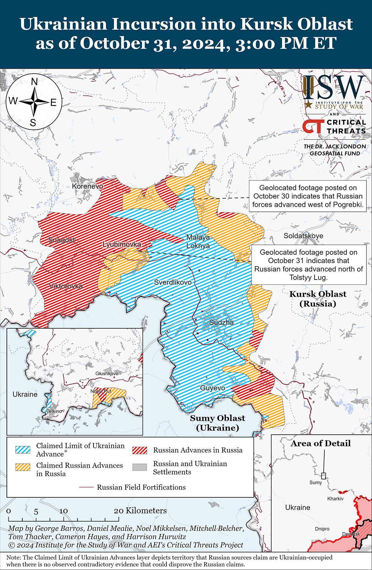 Недавно российские войска предприняли две механизированные контратаки, которые привели к незначительным подтвержденным успехам на украинском выступе в Курской области. На геолоцированных кадрах, опубликованных 30 октября, видно, как украинские войска отбивают российскую механизированную атаку силой до взвода к западу от Погребки (к северо-западу от Суджи), что указывает на то, что российские войска в последнее время незначительно продвинулись в этом районе. [19] На дополнительных геолоцированных кадрах, опубликованных 31 октября, видно, что подразделения 83-й отдельной воздушно-десантной бригады (ВДВ) и 155-й бригады морской пехоты (Тихоокеанский флот, Восточный военный округ) перешли в контрнаступление к востоку от Любимовки (к юго-востоку от Коренево) и незначительно продвинулись в этом районе. [20] Один из российских военных блогеров утверждал, что подразделения российского 137-го полка ВДВ (106-я дивизия ВДВ) захватили Любимовку, в то время как другие военные блогеры утверждали, что бои в этом районе продолжаются и что украинские войска удерживают отдельные позиции в районе Любимовки и к югу от Ольговки (к востоку от Коренево). [21] Российские и украинские войска продолжили боевые действия к западу от Курской области в районе Нового Пути; к югу от Коренево в районе Дарьино; северо-восточнее Суджи в районе Мартыновки; юго-восточнее Коренево в районе Новоивановки и Зеленого Шляха; и юго-восточнее Суджи в районе Плехово. [22] Сообщается, что подразделения российской 106-й дивизии ВДВ и 56-го полка ВДВ (7-я дивизия ВДВ) действуют в Глушковском районе (к западу от выступа Курской области). [23]